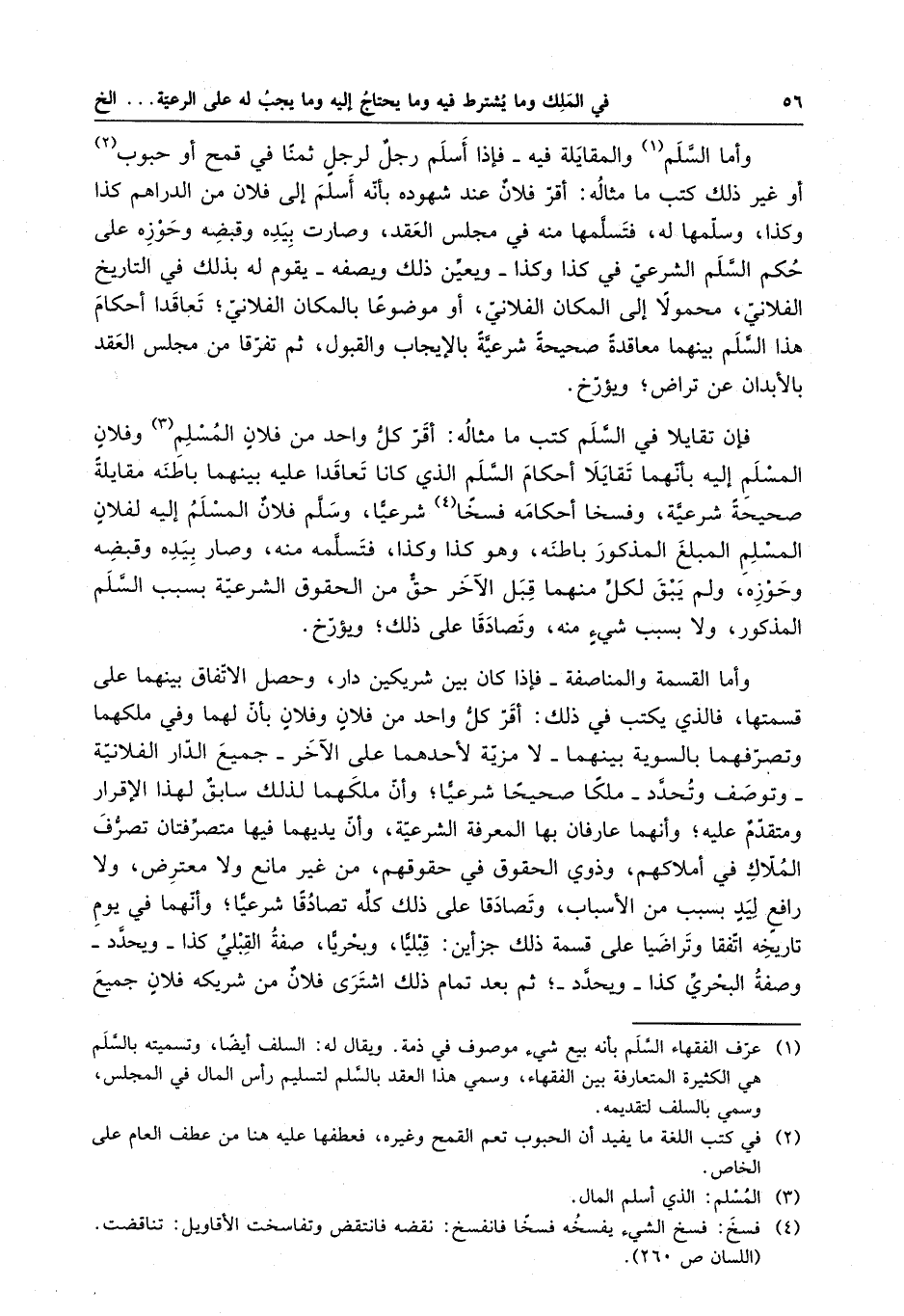 وأما السلم والمقايلة فيه - فإذا أسلم رجل لرجل ثمناً في قمح أو حبوب أو غير ذلك كتب ما مثاله : أقر فلان عند شهوده بأنه أسلم إلى فلان من الدراهم كذا وكذا ، وسلمها ، فتسلمها منه في مجلس العقد ، وصارت بيده وقبضه وحوزه على حكم السلم الشرعي في كذا وكذا - ويعين ذلك ويصفه - يقوم له بذلك في التاريخ الفاني ، محمولاً إلى المكان الفلاني ، أو موضوعاً بالمكان الفلاني ، تعاقداً أحكام هذا السلم بينهما معاقدة صحيحة شرعية بالإيجاب والقبول ، ثم تفرقا من مجلس العقد بالأبدان عن تراض ، ويؤرخ . فإن تقايلا في السلم كتب ما مثاله : أقر كل واحد من فلان المسلم وفلان المسلم إليه بأنهما تقايلا أحكام السلم الذي كانا تعاقدا عليه بينهما باطنه مقايلة صحيحة شرعية ، وفسخا أحكامه فسخاً شرعياً ، وسلم فلان المسلم إليه لفلان المسلم المبلغ المذكور باطنه ، وهو كذا وكذا ، فتسلمه ، منه وصار بيده وقبضه وحوزه ، ولم يبق لكل منهما قبل الآخر حق من الحقوق الشرعية بسبب السلم المذكور ، ولا بسبب شيء منه ، وتصادقا على ذلك ، ويؤرخ .
