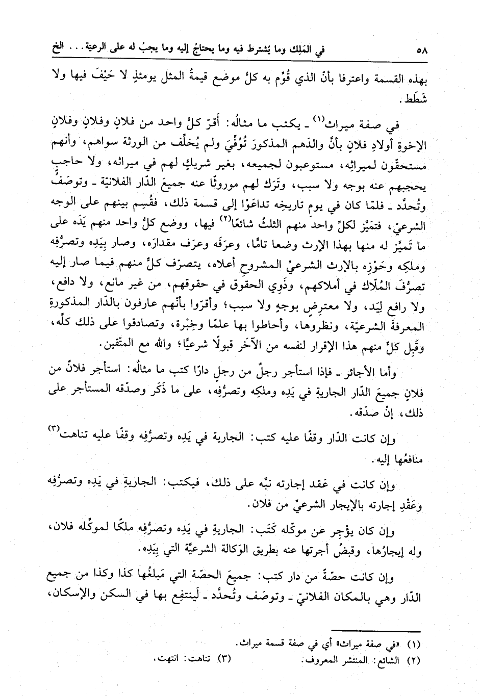 بهذه القسمة واعترفا بأن الذي قوم به كل موضع قيمة المثل يومئذ لا حيف فيها ولا شطط . في صفة ميراث - يكتب ما مثاله : أقر كل واحد من فلان وفلان وفلان الإخوة أولاد فلان بأن والدهم المذكور توفي ولم يخلف من الورثة سواهم ، وأنهم مستحقون لميراثه ، مستوعبون لجميعه ، يغير شريك لهم في ميراثه ، لا حاجبٍ يحجبهم عنه بوجه ولا سبب ، وترك لهم موروثاً عنه جميع الدار الفلانية - وتوصف وتحدد - ، فلما كان في يوم تاريخ تداعوا إلى قسمة ذلك ، فقسم بينهم على الوجه الشرعي ، فتميز لكل واحد منهم الثلث شائعاً فيها ، ووضع كل واحد منهم يده ما تميز له منها بهذا الإرث وضعا تاماً ، وعرفه وعرف مقداره ، وصار بيده وتصرفه وملكه وحوزه بالإرث الشرعي المشروح أعلاه ، ويتصرف كل منهم فيما صار إليه تصرف الملاك في أملاكهم ، وذوي الحقوق في حقوقهم ، من غير مانع ، ولا دافع ، ولا رافع ليد ، ولا معترض بوجه ولا سبب ، وأقروا بأنهم عارفون بالدار المذكورة المعرفة الشرعية ، ونظروها ، وأحاطوا بها علماً وخبرة ، وتصادقوا على ذلك كله ، وقبل كل منهم هذا الإقرار لنفسه من الآخر قبولاً شرعياً ، الله مع المتقين .