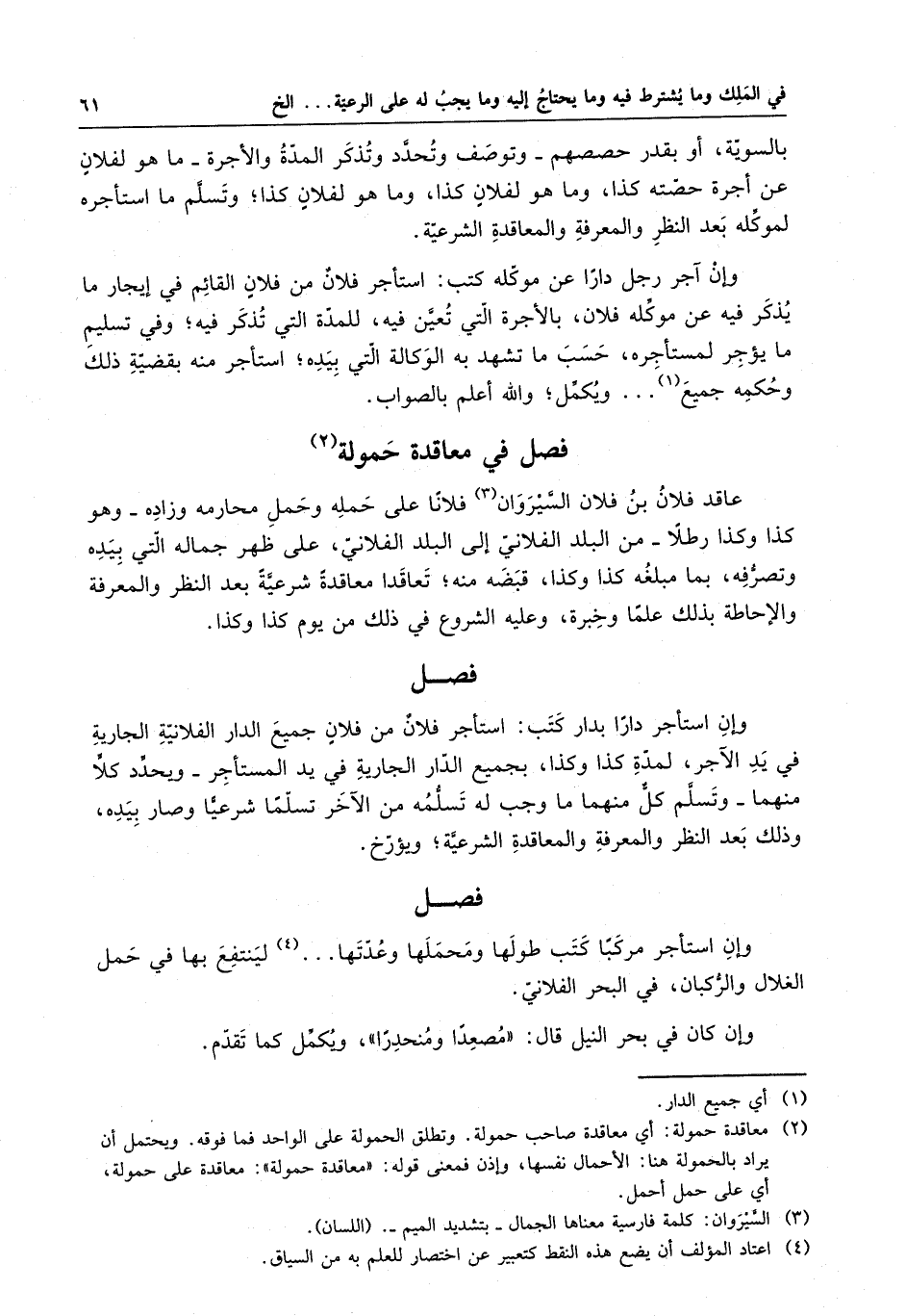 عاقد فلان بن فلان السير وإن فلاناً على حمله وحمل محارمه وزاده - وهو كذا وكذا رطلاً - والبلد الفلاني إلى البلد الفلاني ، على ظهر جماله التي بيده وتصرفه ، بما مبلغه كذا وكذا ، قبضه منه ، تعاقدا معاقدة شرعية بعد النظر والمعرفة والإحاطة بذلك علماً وخبرة ، وعليه الشروع في ذلك من يوم كذا وكذا .
