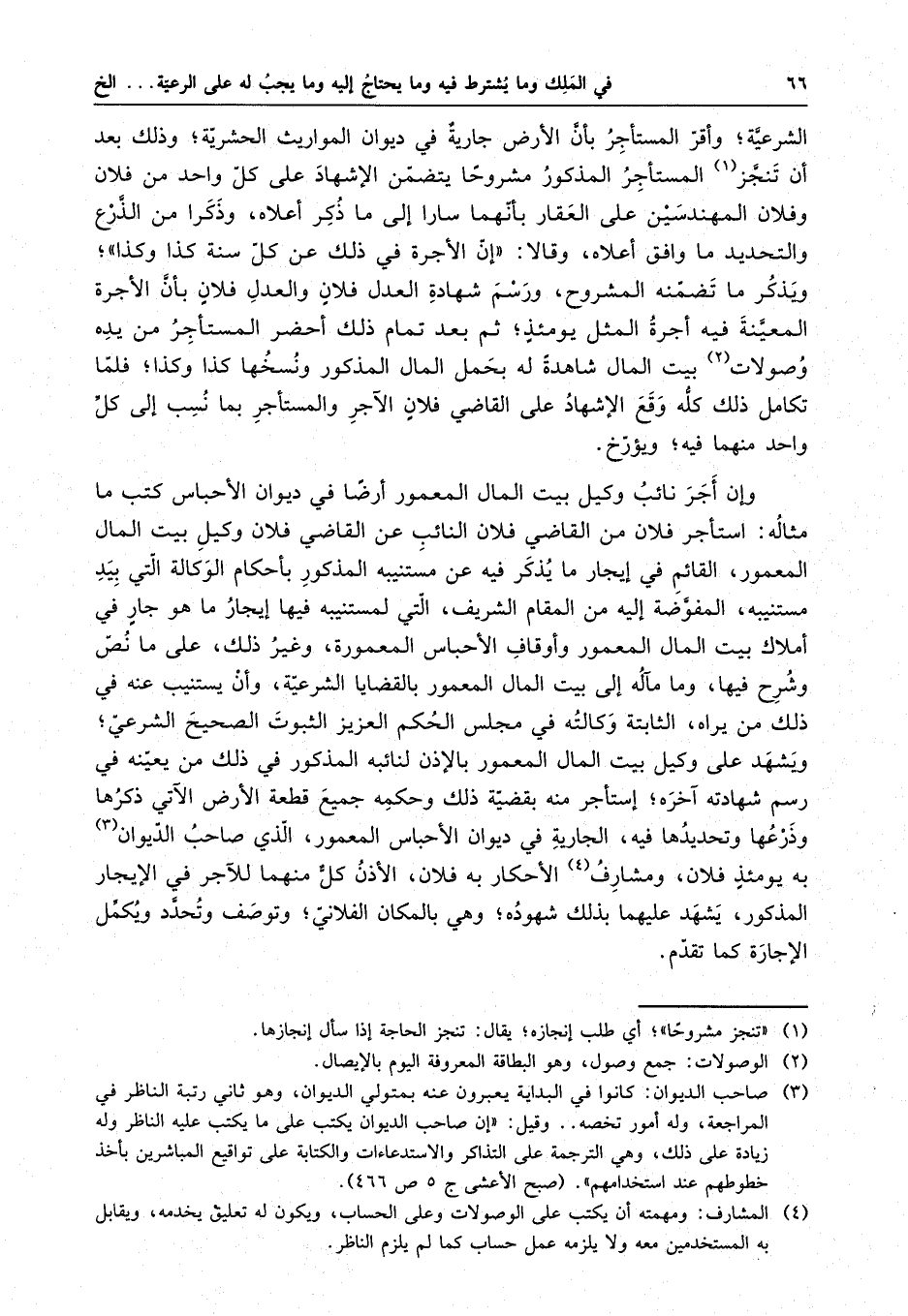 الشرعية ، وأقر المستأجر بأن الأرض جارية في ديوان المواريث الحشرية ، وذلك بعد أن تنجز المستأجر المذكور مشروحاً يتضمن الإشهاد على كل واحد من فلان وفلان المهندسين على العقار بأنهما سارا إلى ما ذكر أعلاه ، وذكراً من الذرع ولا تحديد ما وافق أعلاه ، وقالا : إن الأجرة في ذلك عن كل سنة كذا وكذا ، ويذكر ما تضمنه المشروح ، ورسم شهادة العدل فلان والعدل فلان بأن الأجرة المعينة فيه أجرة يومئذ ، ثم بعد تمام ذلك أحضر المستأجر من يده وصولات بيت المال شاهدة له بحمل المال المذكور ونسخها كذا وكذا ، فلما تكامل ذلك كله وقع الإشهاد على القاضي فلان الآجر والمستأجر بما نسب إلى كل واحد منهما فيه ، ويؤرخ .