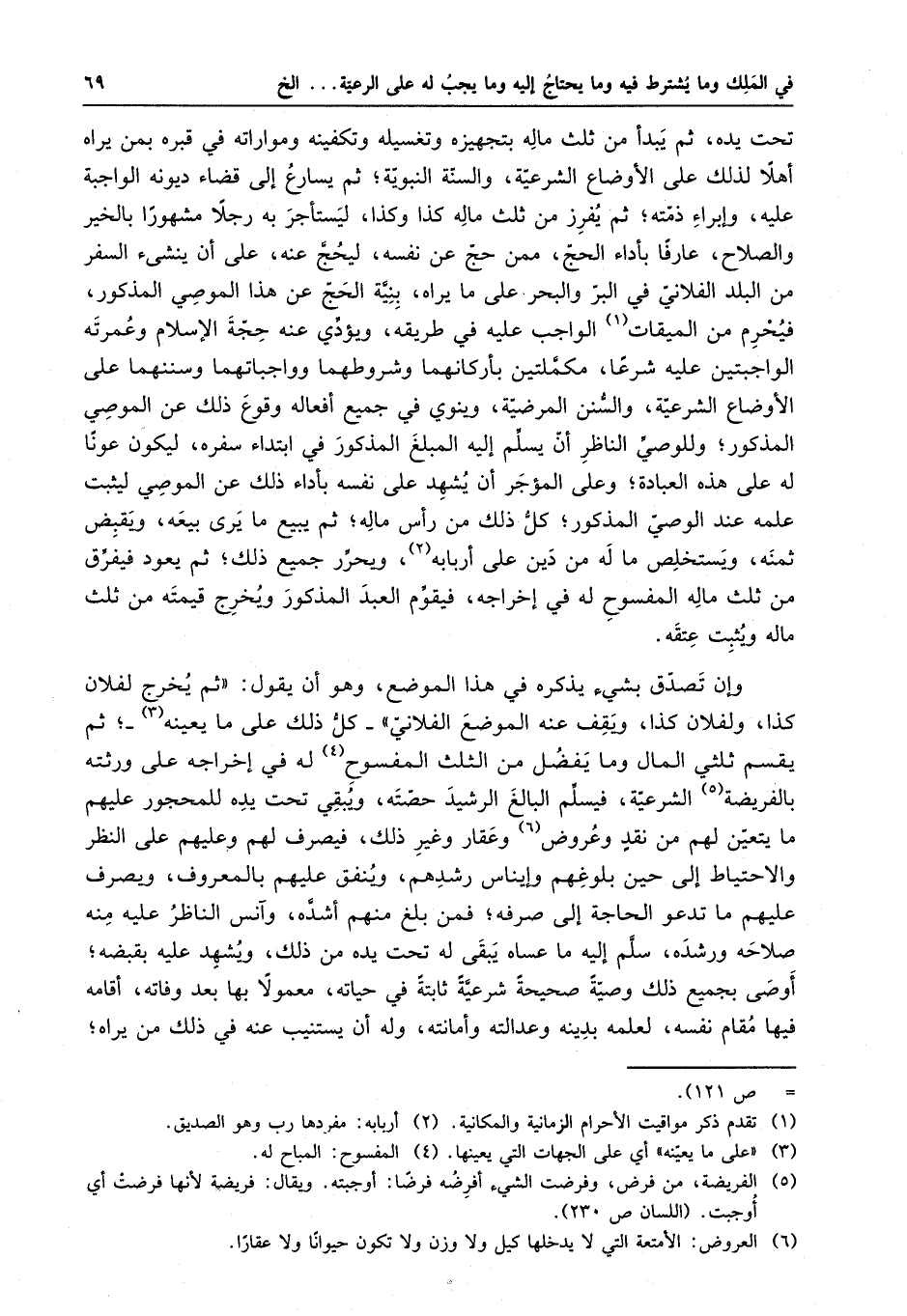 تحت يده ، ثم يبدأ من ثلث ماله بتجهيزه وتغسيله وتكفينه ومواراته في قبره بمن يراه أهلاً لذلك على الأوضاع الشرعية ، والسنة النبوية ، ثم يسارع إلى قضاء ديونه الواجبة عليه ، وإبراء ذمته ، ثم يفرز من ثلث ماله كذا وكذا ، ليستأجر به رجلاً مشهوراً بالخير والصلاح ، عارفاً بأداء الحج ، ممن حج عن نفسه ، ليحج عنه ، على أن ينشئ السفر من البلد الفلاني في البر والبحر على ما يراه ، بنية الحج في هذا الموصي المذكور ، فيحرم من الميقات الواجب عليه في طريقه ، ويؤدي عنه حجة الإسلام وعمرته الواجبتين عليه شرعاً ، مكملتين بأركانهما وشروطهما وواجباتهما وسنتهما على الأوضاع الشرعية ، والسنن المرضية ، وينوى في جميع أفعاله وقوع ذلك عن الموصى المذكور ، وللموصى الناظر أن يسلم إليه المبلغ المذكور في ابتداء سفره ، ليكون عوناً له على هذه العبادة ، وعلى المؤجر أن يشهد على نفسه بأداء ذلك عن الموصى ليثبت علمه عند الوصي المذكور ، كل ذلك من رأس ماله ، ثم يبيع ما يرى بيعه ، ويقبض ثمنه ، ويستخلص ما له من دين على أربابه ، ويحرر جميع ذلك ، ثم يعود فيفرق من ثلث ما له المفسوح له في إخراجه ، فيقوم العبد المذكور ويخرج فيمته من ثلث ماله ويثبت عتقه ، وإن تصدق بشيء يذكره في هذا الموضع ، وهو أن يقول : ثم يخرج لفلان كذا ، ولفلان كذا ، ويقف عنه الموضع الفلاني - كل ذلك ما يعينه - ، ثم يقسم ثلثي المال وما يفضل من الثلث المفسوح له في إخراجه تعلى ورثته بالفريضة الشرعية ، فيسلم البالغ الرشيد حصته ، ويبقى تحت يده للمحجور عليهم ما يتعين لهم من نقد وعروض وعقار وغير ذلك ، فيصرف لهم وعليهم على النظر والاحتياط إلى حين بلوغهم وإيناس رشدهم ، وينفق عليهم بالمعروف ، ويصرف عليهم ما تدعوه الحاجة إلى صرفه ، فمن بلغ منهم أشده ، وآنس الناظر عليه منه صلاحه ورشده ، سلم إليه ما عساه يبقى له تحت يده من ذلك ، ويشهد عليه بقبضه ، أوصى بجميع ذلك وصية صحيحة شرعية ثابتة في حياته ، معمولاً بها بعد وفاته ، أقامه فيها مقام نفسه ، لعلمه بدينه وعدالته وأمانته ، وله أن يستنيب عنه في ذلك من يراه ،
