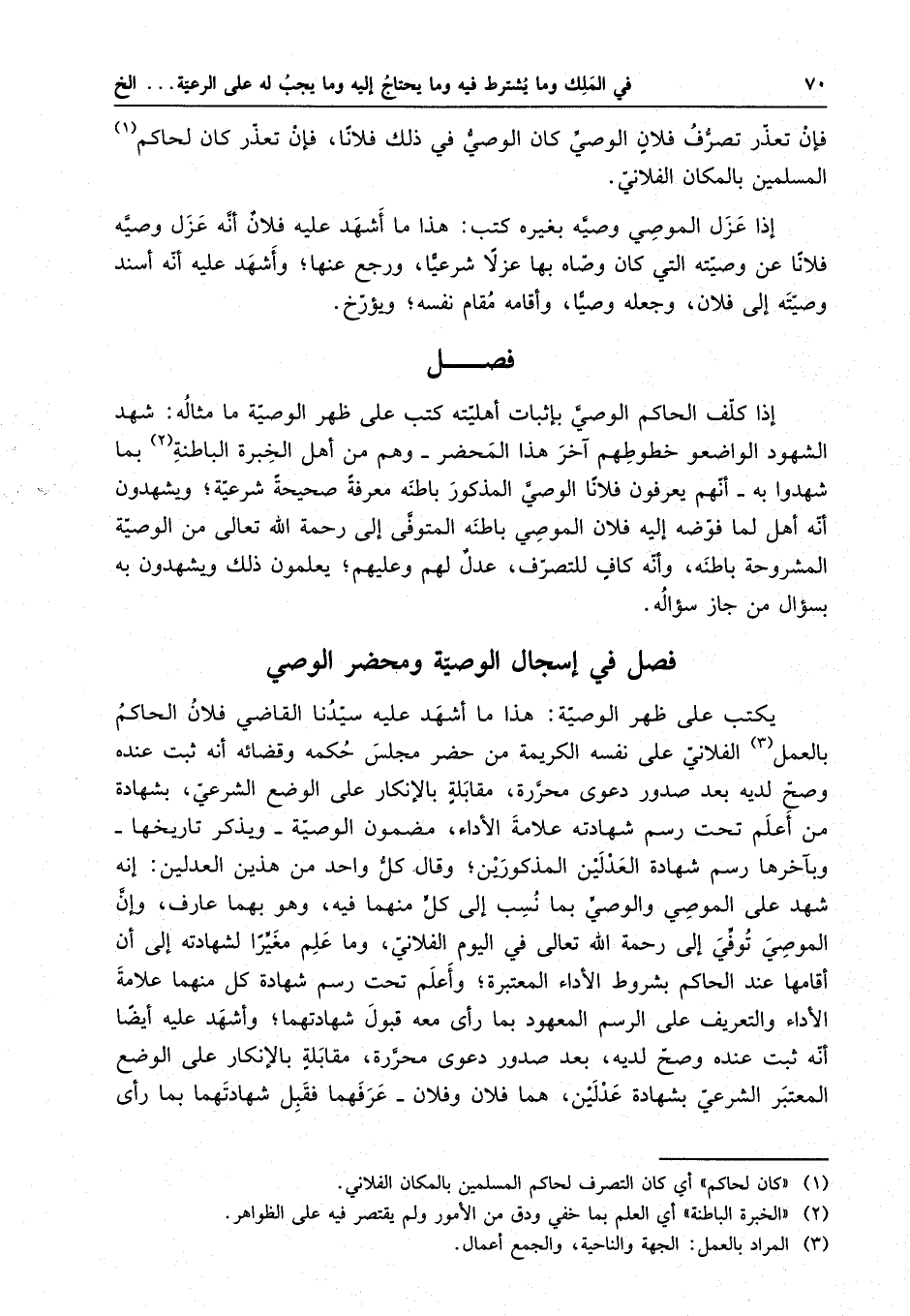 يكتب على ظهر الوصية : هذا ما أشهد عليه سيدنا القاضي فلان الحاكم بالعمل الفلاني على نفسه الكريمة من حضر مجلس حكمه وقضائه أنه ثبت عنده وصح لديه بعد صدور دعوى محررة ، مقابلةٍ بالإنكار على الوضع الشرعي ، بشهادة من أعلم تحت رسم شهادته علامة الأداء ، مضمون الوصية - ويذكر تاريخا - وبآخرها رسم شهادة العدلين المذكورين ، وقال كل واحد من هذين العدلين : إنه شهد على الموصى والوصي بما نسب إلى كل منهما فيه ، وهو بهما عارف ، وإن الموصي توفي إلى رحمة الله تعالى في اليوم الفلاني ، وما علم مغيراً لشهادته إلى أن أقامها عند الحاكم بشروط الأداء المعتبرة ، وأعلم تحت رسم شهادة كل منهما علامة الأداء والتعريف على الرسم المعهود بما رأى معه قبول شهادتهما ، وأشهد عليه أيضاً أنه ثبت عنده وصح لديه ، بعد صدور دعوى محررة ، مقابلة بالإنكار على الوضع المعتبر الشرعي بشهادة عدلين ، هما فلان وفلان - عرفهما فقبل شهادتهما بما رأى