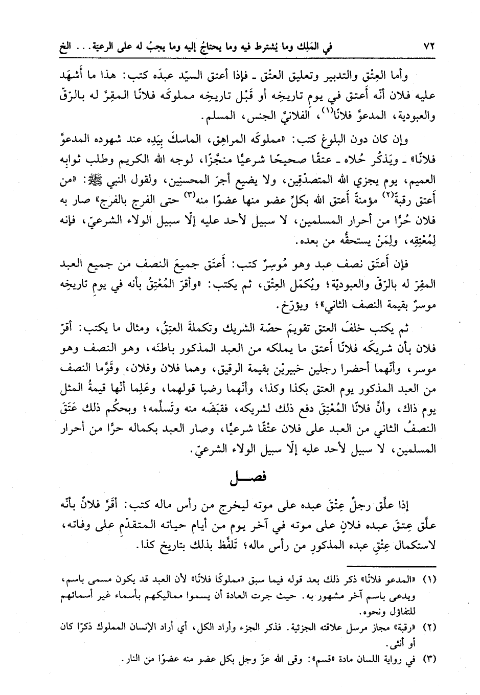 وأما العتق والتدبير وتعليق العتق - فإذا أعتق السيد عبده كتب : هذا ما أشهد عليه فلان أنه أعتق في يوم تاريخه أو قبل تاريخه مملوكه فلاناً المقر له بالرق والعبودية ، المدعو فلاناً ، الفلاني الجنس ، المسلم ، وإن كان دون البلوغ كتب : مملوكه المراهق ، الماسك بيده عند شهوده المدعو فلاناً - ويذكر حلاه - عتقاً صحيحاً شرعياً منجزاً ، لوجه الله الكريم وطلب ثوابه العميم ، يوم يجزى الله المتصدقين ، ولا يضيع أجر المحسنين ، ولقول النبي ( صلى الله عليه وسلم ) : " من أعتق رقبة مؤمنة أعتق الله بكل عضو منها عضواً منه حتى الفرج بالفرج صار " صار به فلان حراً من أحرار المسلمين ، لا سبيل لأحد عليه إلا سبيل الولاء الشرعي ، فإنه لمعتقه ، ولمن يستحقه من بعده .