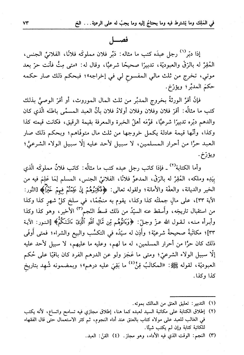 وأما الكتابة - فإذا كاتب رجل عبده كتب ما مثاله : كاتب فلان مملوكه الذي بيده وملكه ، المقرّ له بالرق ، المدعوّ فلاناً ، الفلاني الجنس ، المسلم لما علم فيه من الخير والديانة ، والعفة والأمانة ، ولقوله تعالى : " فكاتبوهم إن علمتم فيهم خيراً " ، على مالٍ جمالته كذا وكذا ، ويقوم به منجماً ، في سلخ كل شهر كذا وكذا من استقبال تاريخه ، وأسقط عنه السيد من ذلك قسط النجم الأخير ، وهو كذا وكذا وأبرأه منه ، وأسقط عنه السيد من ذلك قسط النجم الأخير ، وهو كذا وكذا وأبرأه منه ، لقول الله عز وجل : " وآتوهم من مال الله الذي أتاكم " ، مكاتبة صحيحة شرعية ، وأذن له سيده في التكسب والبيع والشراء ، فمتى أوفى ذلك كان حراً من أحرار المسلمين ، له مالهم ، وعليه ما عليهم ، ولا سبيل لأحد عليه إلا سبيل الولاء الشرعي ، ومتى ما عجز ولو عن الدرهم الفرد كان باقياً على حكم العبودية ، لقوله ( صلى الله عليه وسلم ) : " المكاتب قن ما بقي عليه درهم " ، وبمضمونه شهد بتاريخ كذا وكذا .