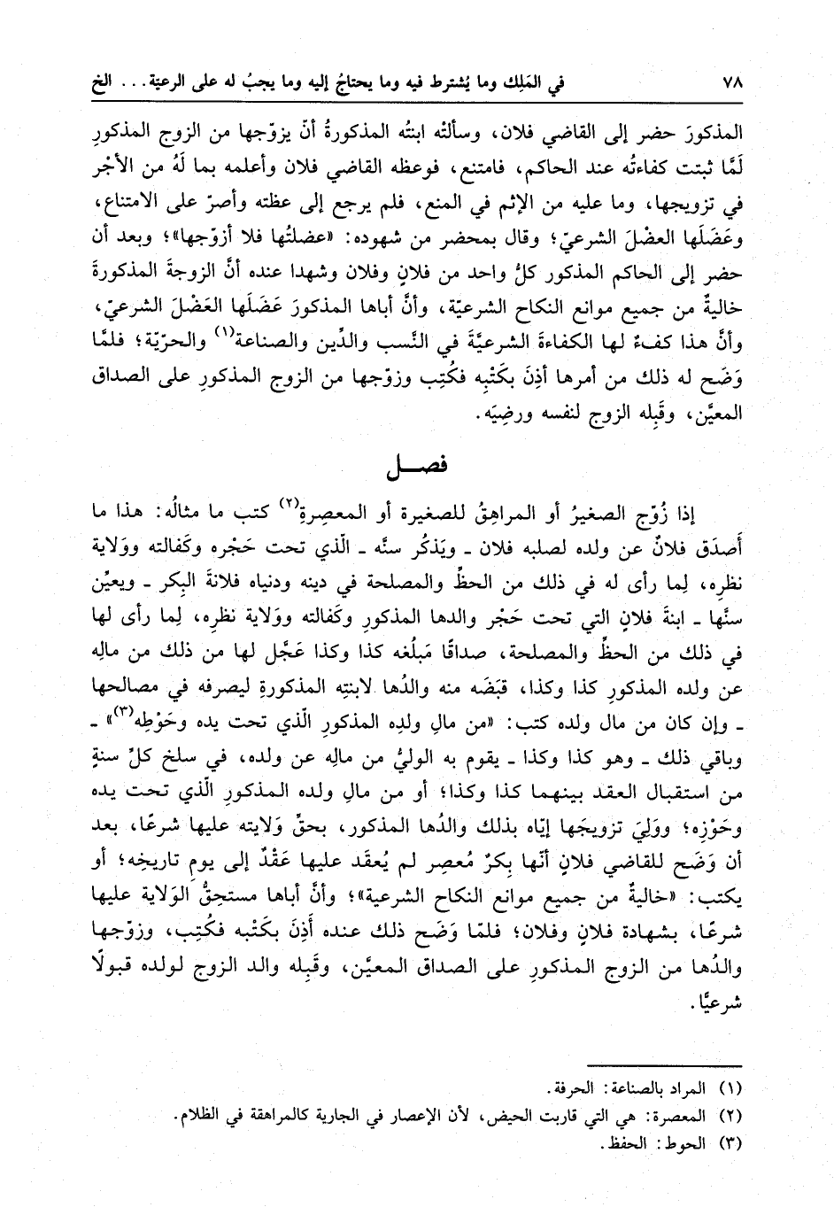 المذكور حضر إلى القاضي فلان ، وسألته ابنته المذكورة أن يزوجها من الزوج المذكور لما ثبتت كفاءته عند الحاكم ، فامتنع ، فوعظه القاضي فلان وأعلمه بماله من الأجر في تزويجها ، وما عليه من الإثم في المنع ، فلم يرجع إلى عظته وأصر على الامتناع ، وعضلها العضل الشرعي ، وقال بمحضر من شهوده : عضلتها فلا أزوجها ، وبعد أن حضر إلى الحاكم المذكور كل واحد من فلان وفلان وشهدا عنده أن الزوجة المذكورة خالية من جميع موانع النكاح الشرعية ، وأن أباها المذكور عضلها العضل الشرعي ، وأن هذا الكفء لها الكفاءة الشرعية في النسب والدين الصناعة والحرية ، فلما وضح له ذلك من أمرها أذن بكتبه فكتب وزوجها من الزوج المذكور على الصداق المعين ، وقبله الزوج لنفسه ورضيه .