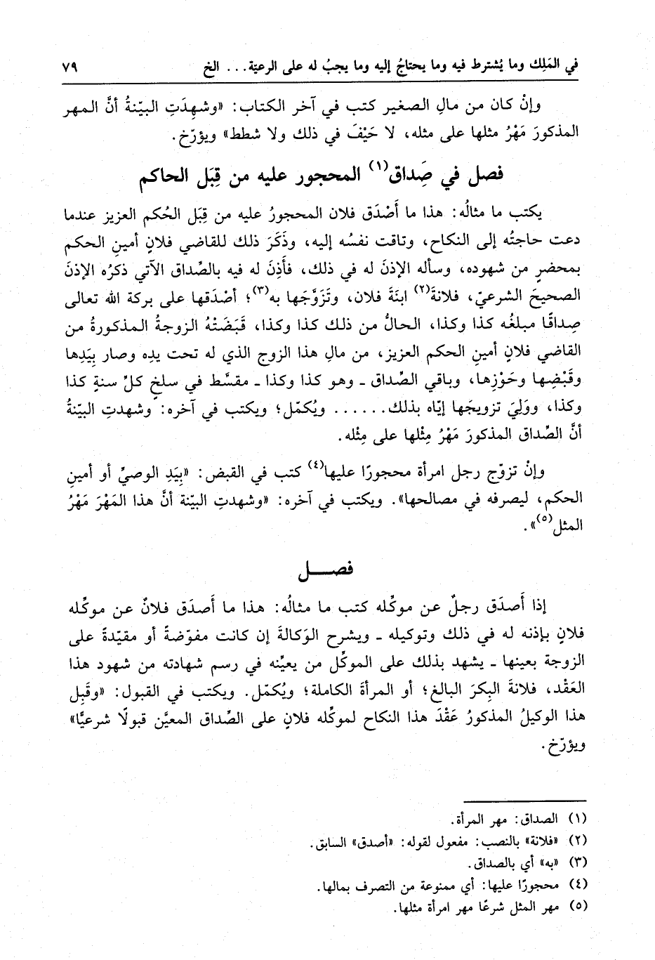 يكتب ما مثاله : هذا ما أصدق فلان المحجور عليه من قبل الحكم العزيز عندما دعت حاجته إلى النكاح ، وتاقت نفسه إليه ، وذكر ذلك للقاضي فلان أمين الحكم بمحضر من شهوده ، وسأله الإذن له في ذلك ، فأذن له فيه بالصداق الآتي ذكره الإذن الصحيح الشرعي ، فلانة ابنة فلان ، وتزوجها به ، أصدقها على بركة الله تعالى صداقاً مبلغه كذا وكذا ، الحال من ذلك كذا وكذا ، قبضته الزوجة المذكورة من القاضي فلان أمين الحكم العزيز ، من مال هذا الزوج الذي له تحت يده وصار بيدها وقبضها وحوزها ، وباقي الصداق - وهو كذا وكذا - مقسط في سلخ كل سنة كذا وكذا ، وولي تزويجها إياه بذلك . . . . ويكمل ، ويكتب في آخره : وشهدت البنية أن الصداق المذكور مهر مثلها على مثله .
