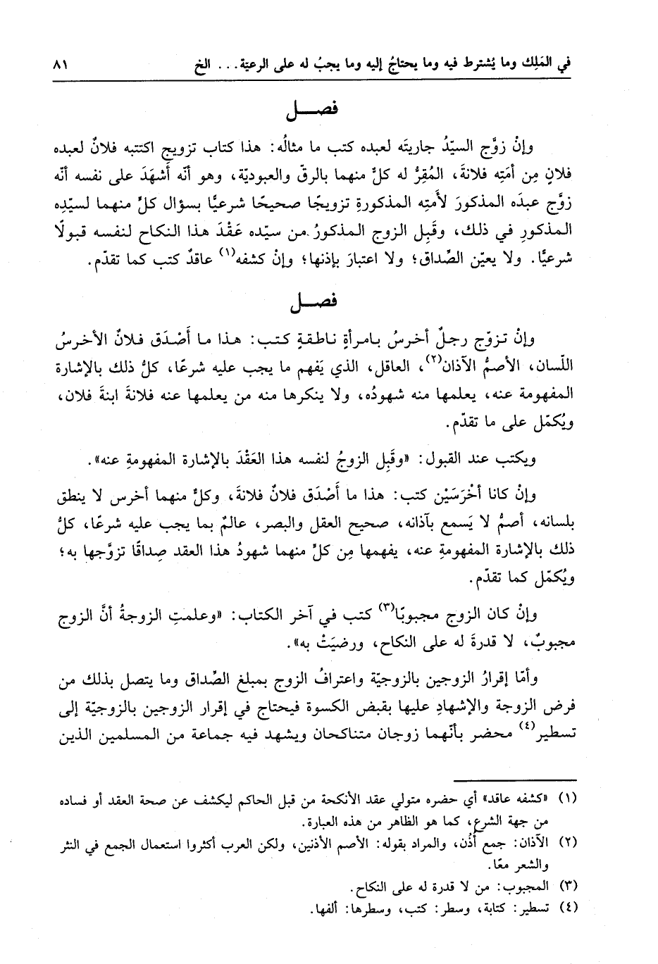 إن زوج جاريته لعبده كتب ما مثاله : هذا كتاب تزويج اكتتبه فلان لعبده فلان من أمته فلانة ، المقر له منهما بالرق والعبودية ، وأنه أشهد على نفسه أنه زوج عبده المذكور لأمته المذكورة تزويجاً صحيحاً شرعياً بسؤال كل منهما لسيده المذكور في ذلك ، وقبل الزوج المذكور من سيده عقد هذا النكاح لنفسه قبولاً شرعياً . ولا يعين الصداق ، ولا اعتبار بإذنها ، وإن كشفه عاقد كتب كما تقدم .
