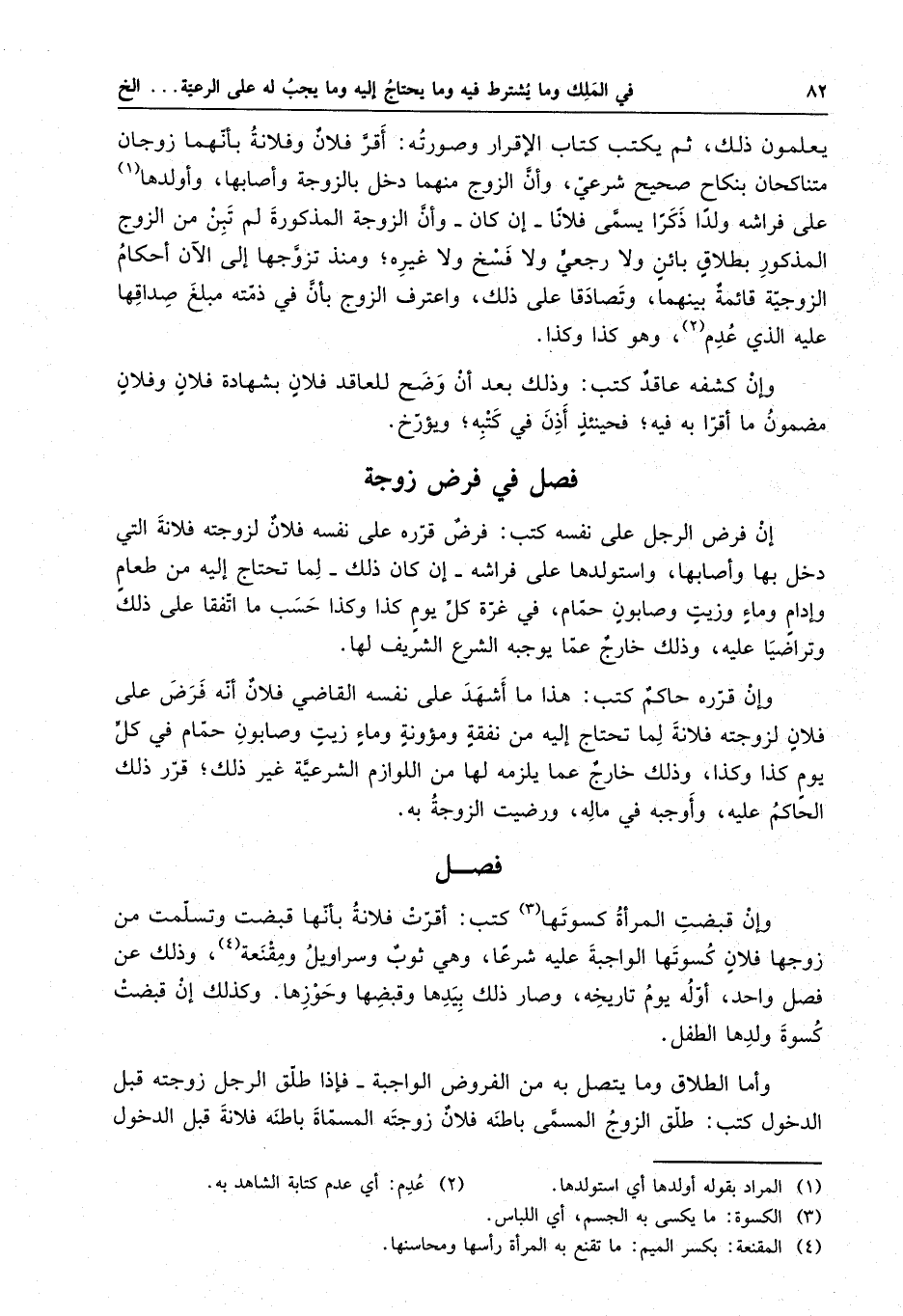 وأما الطلاق وما يتصل به من الفروض الواجبة - فإذا طلق الرجل زوجته قبل الدخول كتب : طلق الزوج المسمى باطنه فلان زوجته المسماة باطنه فلانة قبل الدخول