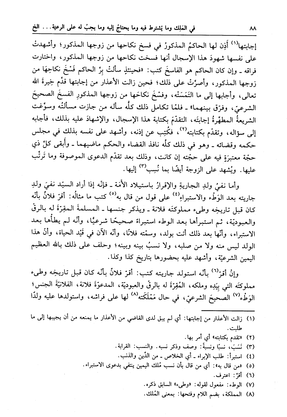 إجابتها أذن لها الحاكم المذكور في فسخ نكاحها من زوجها المذكور ، وأشهدت على نفسها شهود هذا الإسجال أنها فسخت نكاحها من زوجها المذكور ، واختارت فراقه - وإن كان الحاكم هو الفاسخ كتب : فحينئذ سألت بر الحاكم فسخ نكاحها من زوجها المذكور ، وأصرت على ذلك ، فحين زالت الأعذار من إجابتها قدم خيرة الله تعالى ، وأجابها إلى ما التمسته ، وفسخ نكاحها من زوجها المذكور الفسخ الصحيح الشرعي ، وفرق بينهما - فلما تكامل ذلك كله سأله من جازت مسألته وسوغت الشريعة المطهرة إجابته ، التقدم بكتابة هذا الإسجال ، والإشهاد عليه بذلك ، فأجابه إلى سؤاله ، وتقدم بكتابته ، فكتب عن إذنه ، وأشهد على نفسه بذلك في مجلس حكمه وقضائه - وهو في ذلك كله نافذ القضاء والحكم ماضيهما - وأبقى كل ذي حجة معتبرة فيه على حجته إن كانت ، وذلك بعد تقدم الدعوى الموصوفة وما ترتب عليها . ويشهد على الزوجة أيضاً بما نسب إليها . وأما نفي ولد الجارية والإقرار باستيلاد الأمة - فإنه إذا أراد السيد نفي ولد جاريته بعد الوطء والاستبراء على قول من قال به كتب ما مثاله : أقر فلان بأنه كان قبل تاريخه وطئ مملوكته فلانة - ويذكر جنسها - المسلمة المقترة له بالرق والعبودية ، ثم استبرأها بعد الوطء استبراء صحيحاً شرعياً ، وأنه لم يطأها بعد الاستبراء ، وأنها بعد ذلك أتت بولد ، وسمته فلاناً ، وأنه الآن في قيد الحياة ، وأن هذا الولد ليس منه ولا من صلبه ، ولا نسب بينه وبينه ، وحلف على ذلك بالله العظيم اليمين الشرعية ، وأشهد عليه بحضورها بتاريخ كذا وكذا .