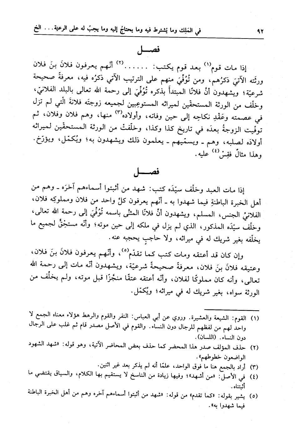 كتب : شهد من أثبتوا أسماءهم أخره - وهم من أهل الخبرة الباطنة فيما شهدوا به - أنهم يعرفون كل واحد من فلان ومملوكه فلان ، الفلاني الجنس ، المسلم ، ويشهدون أن فلاناً المثنى باسمه توفي إلى رحمة الله تعالى ، وخلف سيده المذكور ، الذي لم يزل في ملكه إلى حين موته ، وأنه مستحق لجميع ما يخلفه بغير شريك له في ميراثه ، ولا حاجب يحجبه عنه .