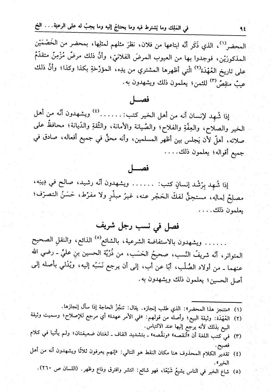 . . . . . . ويشهدون بالاستفاضة الشرعية ، بالشائع الذائع ، والنقل الصحيح المتواتر ، أنه شريف النسب ، صحيح الحسب ، من ذرية الحسين بن علي - رضي الله عنهما - من أولاد الصلب ، أبا عن أب ، إلى أن يرجع نسبه إليه ، ويدلي بأصله إلى أصل الحسين ، يعلمون ذلك ويشهدون به .