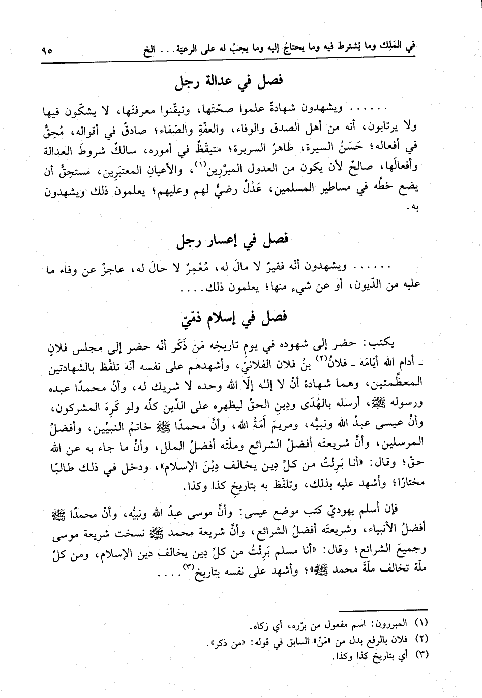 . . . . . . ويشهدون شهادة علموا صحتها ، وتيقنوا معرفتها ، لا يشكون فيها ولا يرتابون ، أنه من أهل الصدق والوفاء ، والعفة والصفاء ، صادق في أقواله ، محق في أفعاله ، حسن السيرة ، طاهر السريرة ، متيقظ في أموره ، سالك شروط العدالة وأفعالها ، صالح لأن يكون من العدول المبررين ، والأعيان المعتبرين ، مستحق أن يضع خطة في مساطير المسلمين ، عدل رضي لهم وعليهم ، يعلمون ذلك ويشهدون به .
