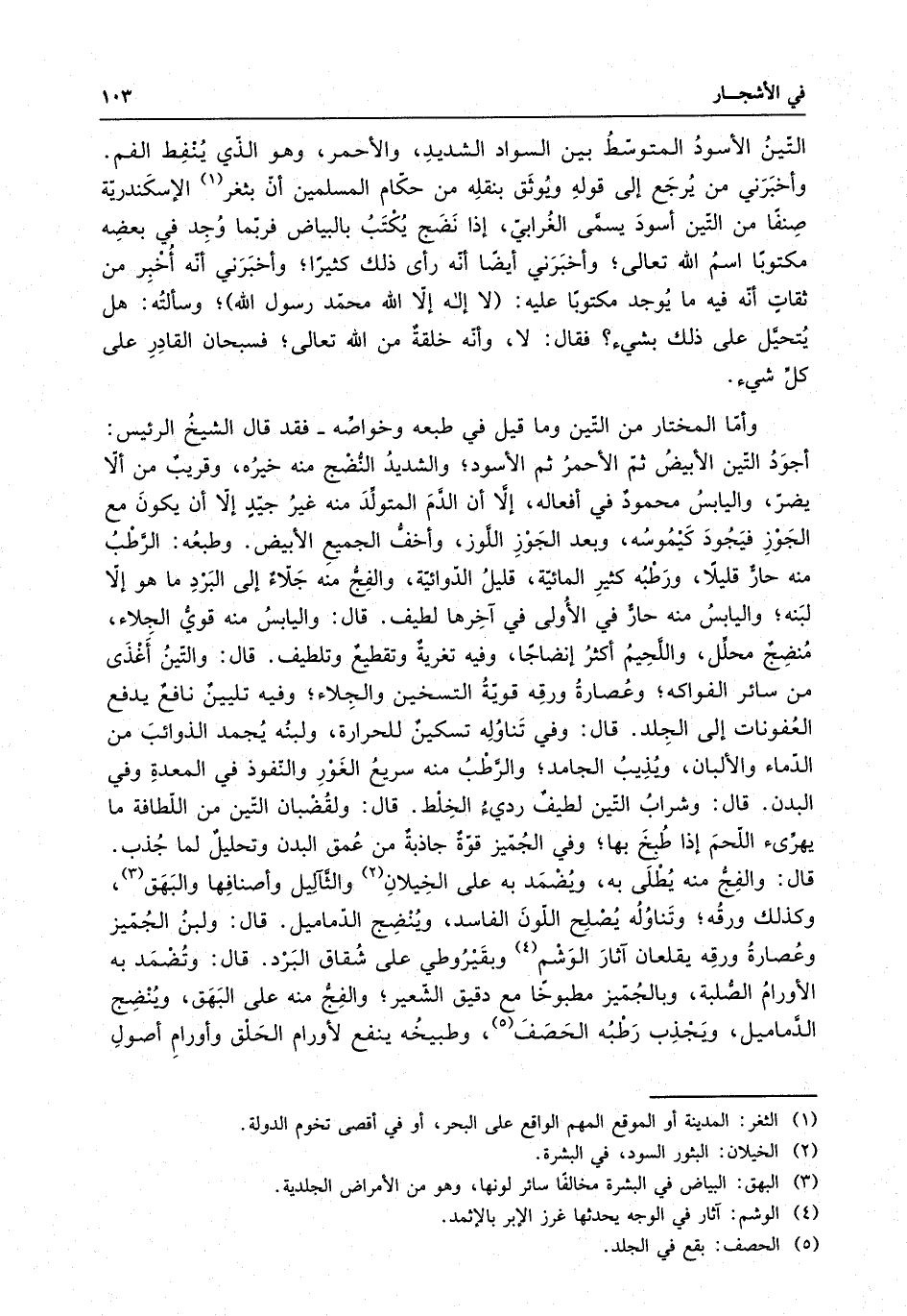 التين الأسود المتوسطُ بين السواد الشديد ، والأحمر ، وهو الذي ينفط الفم . وأخبرني من يرجع إلى قوله ويوثق بنقله من حكام المسلمين أن بثغر الإسكندرية صنفا من التين أسود يسمى الغُرابي ، إذا نضج يكتب بالبياض فربما وجد في بعضه مكتوبا أسم الله تعالى ، وأخبرني أيضا أنه رأى ذلك كثيرا ، وأخبرني أنه أخبر من ثقاتٍ أنه فيه ما يوجد مكتوباً عليه : " لا إله إلى الله محمد رسول الله " ، وسألته : هل يُتحيل على ذلك بشيء ؟ فقال : لا ، وأنه خلقةٌ من الله تعالى ، فسبحان القادر على كل شيء . وأما المختار من التين وما قيل في طبعه وخواصه : فقد قال الشيخ الرئيس : أجود التين الأبيض ثم الأحمر ثم الأسود ، والشديد النضج منه خيره ، وقريب من ألا يضر ، واليابس محمود في أفعاله ، إلا أن الدم المتولد منه غير جيدٍ إلا أن يكون مع الجوز فيجود كيموسه ، وبعد الجوز واللوز ، وأخف الجميع الأبيض . وطبعه : الرطب منه حار قليلا ، ورطبه كثير المائية ، قليل الدوائية ، والفج منه جلاء إلى البرد ما هو إلا لبنه ، واليابسُ منه حارٌّ في الأولى في آخرها لطيف . قال : واليابس منه قوي الجلاء ، منضجٌ محلل ، واللحيُم أكثر إنضاجاً ، وفيه تغريةٌ وتقطيعٌ وتلطيف . قال : والتين أغذى من سائر الفواكه ، وعصارة ورقه قوية التسخين والجلاء ، وفيه تليين نافع يدفع العفونات إلى الجلد . قال : وفي تناوله تسكين للحرارة ، ولبنه يجمد الذوائب من الدماء والألبان ، ويذيب الجامد ، والرطب منه سريع الغور والنفوذ في المعدة وفي البدن . قال : وشراب التين لطيفٌ رديء الخلط . قال : ولقضبان التين من اللطافة ما يهريء اللحم إذا طبخ بها ، وفي الجميز قوةٌ جاذيةٌ من عميق البدن وتحليلٌ لما جذب . قال : الفج منه يطلي به ، ويضمد به على الحيلان والثاليل وأصنافها والبهق ، وكذلك ورقه ، وتناوله يصلح اللون الفاسد ، وينضج الدماميل . قال : ولبنُ الجُميز عصارة ورقه يقلعان أثار الوشم وبقيروطي على شقاق البرد . قال : وتضمد به الأورام الصلبة ، والجميز مطبوخا مع دقيق الشعير ، والفج منه على البهق ، وينضج الدماميل ، ويجذب رطبه الحصف ، وطبيخه ينفع لأورام الحلق وأورام أصول