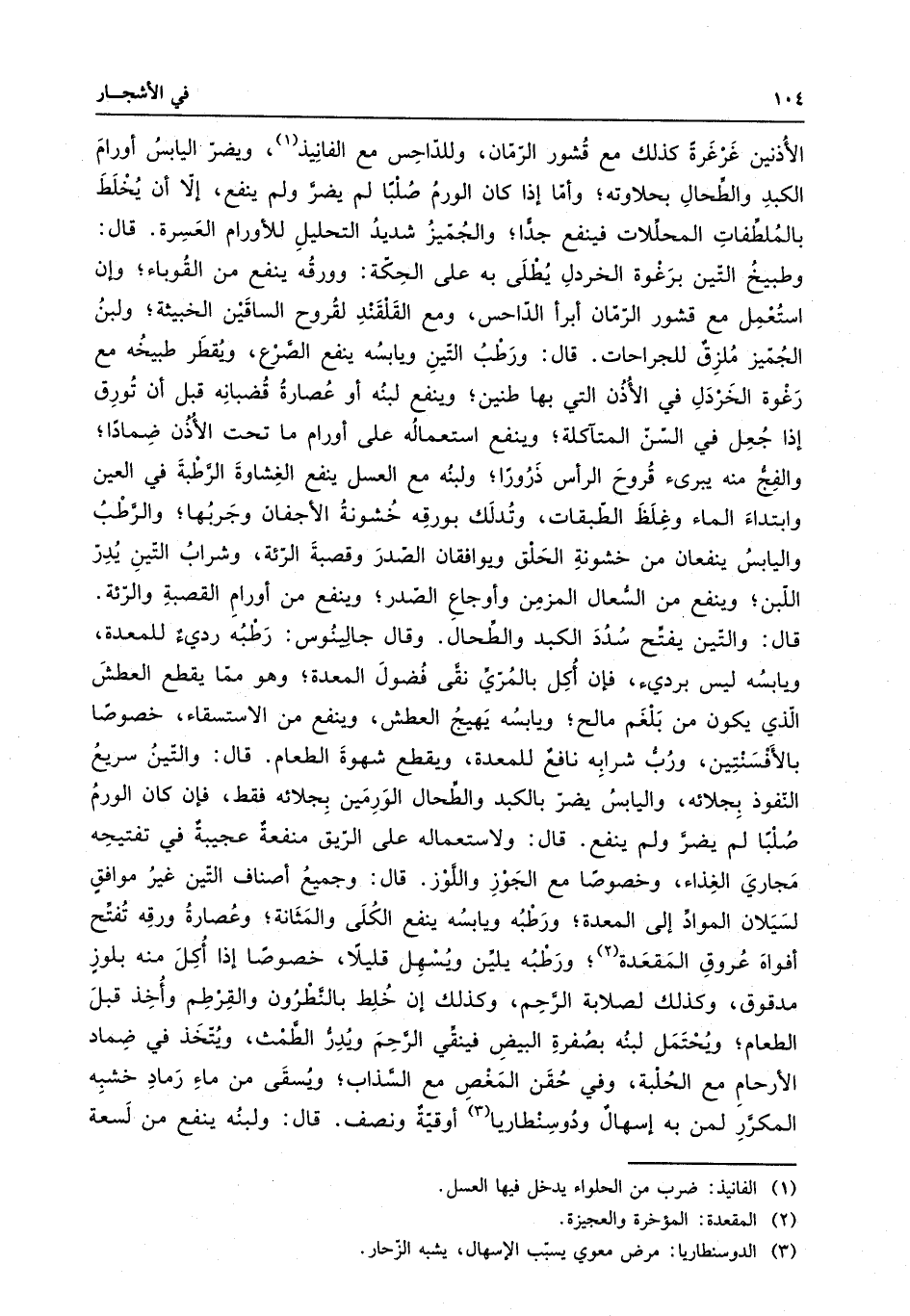 الأذنين غرغرة كذلك مع قشور الرمان ، وللداحس مع الفانيذ ، ويضر اليابس أورام الكبد والطحال بحلاوته ، وأما إذا كان الورم صلباً لم يضر ولم ينفع ، إلا أن يخلط بالملطفات المحللات فينفع جدا ، والجميز شديد التحليل للأورام العسرة . قال : وطبيخ التين برغوة الخردل يطلي به على الحكة : وورقه ينفع من القوباء ، وان ستعمل مع قشور الرمان أبرأ الداحس ، ومع القلفند لقروح الساقين الخبيثة ، ولبن الجميز ملزق للجروحات . قال ورطب التين ويابسه ينفع الصرع ، ويقطر طبيخه مع رغوة الخردل في الأذن التي بها طنين ، وينفع لبنه أو عصارة قضبانه قبل أن تورق إذا جعل في السن التأكله ، وينفع استعماله على الأورام ما تحت الأذن ضمادا ، والفج منه يبريء قروح الرأس ذرورا ، ولبنه مع العسل ينفع الغشاوة الرطبة في العين وابتداء الماء وغلظ الطبقات ، وتدلك بورقه خشونة الأجفان وجربها ، والرطب اليابس ينفعان من خشونة الحلق ويوافقان الصدر وقصبة الرئة ، وشراب التين يدر اللبن ، وينفع من السعال المزمن وأوجاع الصدر ، وينفع من أورام القصبة والرئة . قال : والتين يفتح سدد الكبد والطحال . وقال جالينوس : رطبه رديء للمعدة ، ويابسه ليس برديء ، فإن أكل بالُمري نقي فضول المعدة ، وهو مما يقطع العطش الذي يكون من بلغم مالح ، ويابسه يهيج العطش ، وينفع من الأستقساء ، خصوصا بالأفسنتين ، ورب شرابه يضر بالكبد والطحال الورمين بجلائه فقط ، فإن كان الورم صلباً لم يضر ولم ينفع . قال : ولاستعماله على الريق منفعة عجيبةٌ في تفتيحه مجاري الغذاء ، وخصوصا مع الجوز واللوز . قال : وجميع أصناف التين غير موافقٍ لسيلان المواد إلى المعدة ، ورطبه ويابسه ينفع الكلى والمثانة ، وعصارة ورقه تفتح أفواه عروق المقعدة ، ورطبه يلين ويسهل قليلا ، خصوصا إذا أكل منه بلوزٍ مدقوق ، وكذلك لصلابة الرحم ، وكذلك إن خلط بالنطرون والقرطم وأخذ قبل الطعام ، ويحتمل لبنه بصفرة البيض فينقي الرحم ويدر الطمث ، ويتخذ في الضماد الأرحام مع الحلبة ، وفي حقن المغص مع السذاب ، ويسقى من ماء رماد خشبه المكرر لمن به إسهال ودوسنطاريا أوقية ونصف . قال : ولبنه ينفع من لسعة