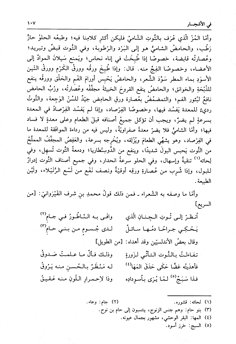 وأما المُزّ الذي يعرف بالتوت الشامي فليكن أكثر كلاً منا فيه ، وطبعه الحلو حار رطب ، والحامض الشامي هو إلى البرد والرطوبة ، وفي التوت قبضٌ وتبريد ، وعصارته قابضة ، خصوصاً إذا طبخت في إناء نحاس ، ويمنع سيلان المواد إلى الأعضاء ، وخصوصاً الفج منه . قال : وإذا طبخ ورقه وورق الكرم وورق التين الأسود بماء المطر سود الشعر ، والحامضُ يحبس أورام الفم والحلق وورقه ينفع للذبحة والخوانق ، والحامضُ ينفع القروح الخبيثة مجففه وعصارته ، ورب الحامض نافع لبثور الفم ، والتمضمض بعصارة ورق الحامض جيد للسن الوجعة ، والتوت رديءٌ للمعدة يفسد فيها ، وخصوصاً الفرِصْاد ، وإذا لم يفسد الِفرْصادُ في المعدة بسرعةٍ لم يضر ، ويجب أن تؤكل جميع أصنافه قبل الطعام وعلى معدةٍ لا فساد فيها ، وأما الشامي فلا يضر معدةً صفراويةً ، وليس فيه من رداءة الموافقة للمعدة ما في الفرصاد ، وهو يشهي الطعام ويزلقه ، ويخرجه بسرعة ، والعفصُ المجفف المملح من التوت يحبس البول شديداً ، وينفع من الدُوِسنْطاريا ، ودمعةُ التوت تسهل ، وفي لحائه تنقيةٌ وإسهال ، وفي الحلو سرعةُ انحدار ، وفي جميع أصناف التوت إدرارٌ للبول ، وإذا شرب من عصارة ورقه أوقيةٌ ونصف نفع من لسع الرتَيْلاء ، ولين الطبيعة . وأما ما وصفه به الشعراء - فمن ذلك قولُ محمد بن شرف القيرواني :