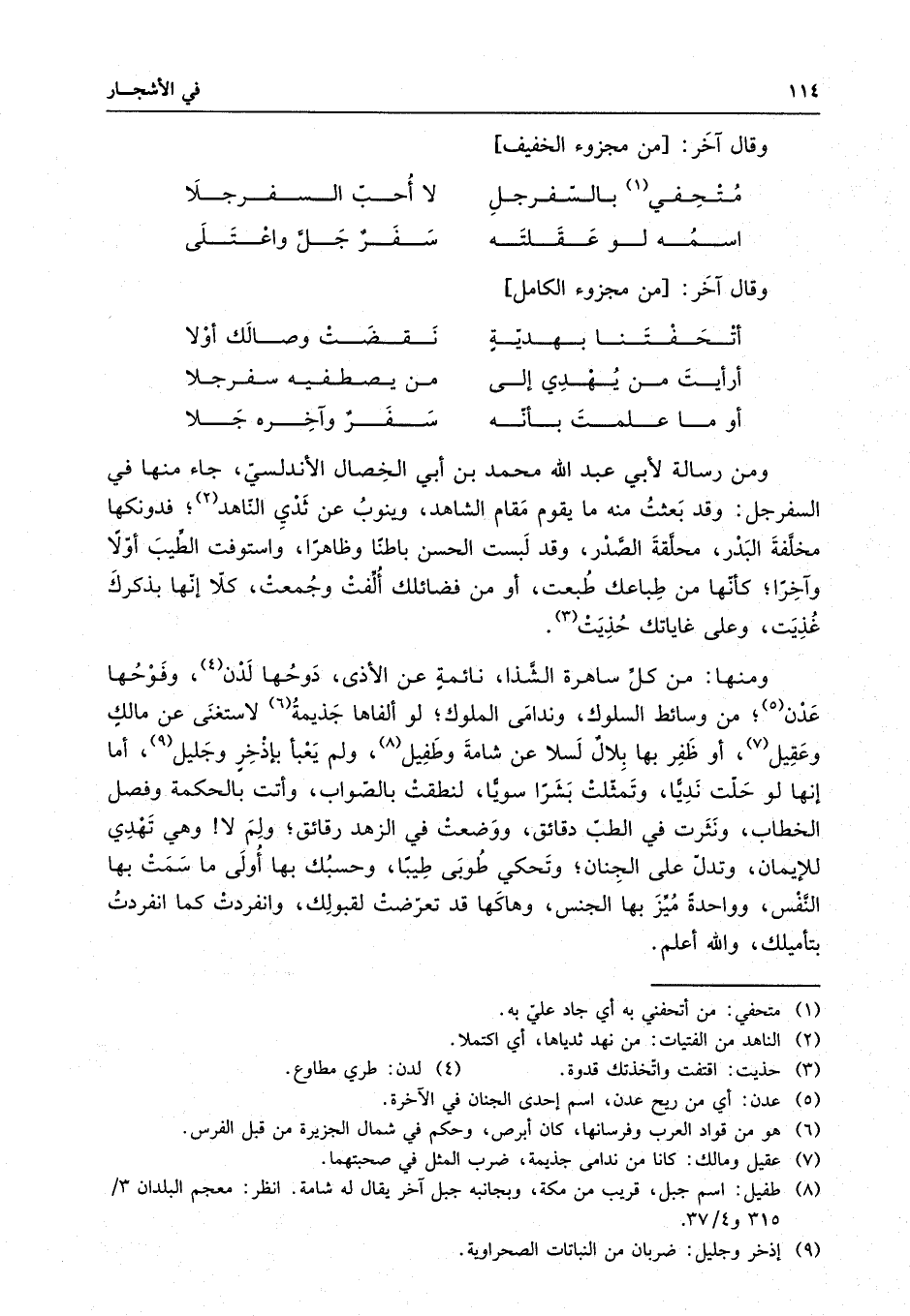 ومن رسالة لأبي عبد الله محمدٍ بن أبي الخِصال الأندلسي ، جاء في السفرجل : وقد بعثتُ منه ما يقوم مقام الشاهد ، وينوب عن ثدي الناهد ، فدونكها مخلفة البدر ، محلقة الصدر ، قد لبست الحسن باطناً وظاهراً ، واستوفت الطيب أولاً وآخِرا ، كأنها من طباعك طُبعت ، أومن فضائلك ألفتْ وجُمعتْ ، كلا إنها يذكرك غُذَيت ، وعلى غاياتك حُذيَتْ .