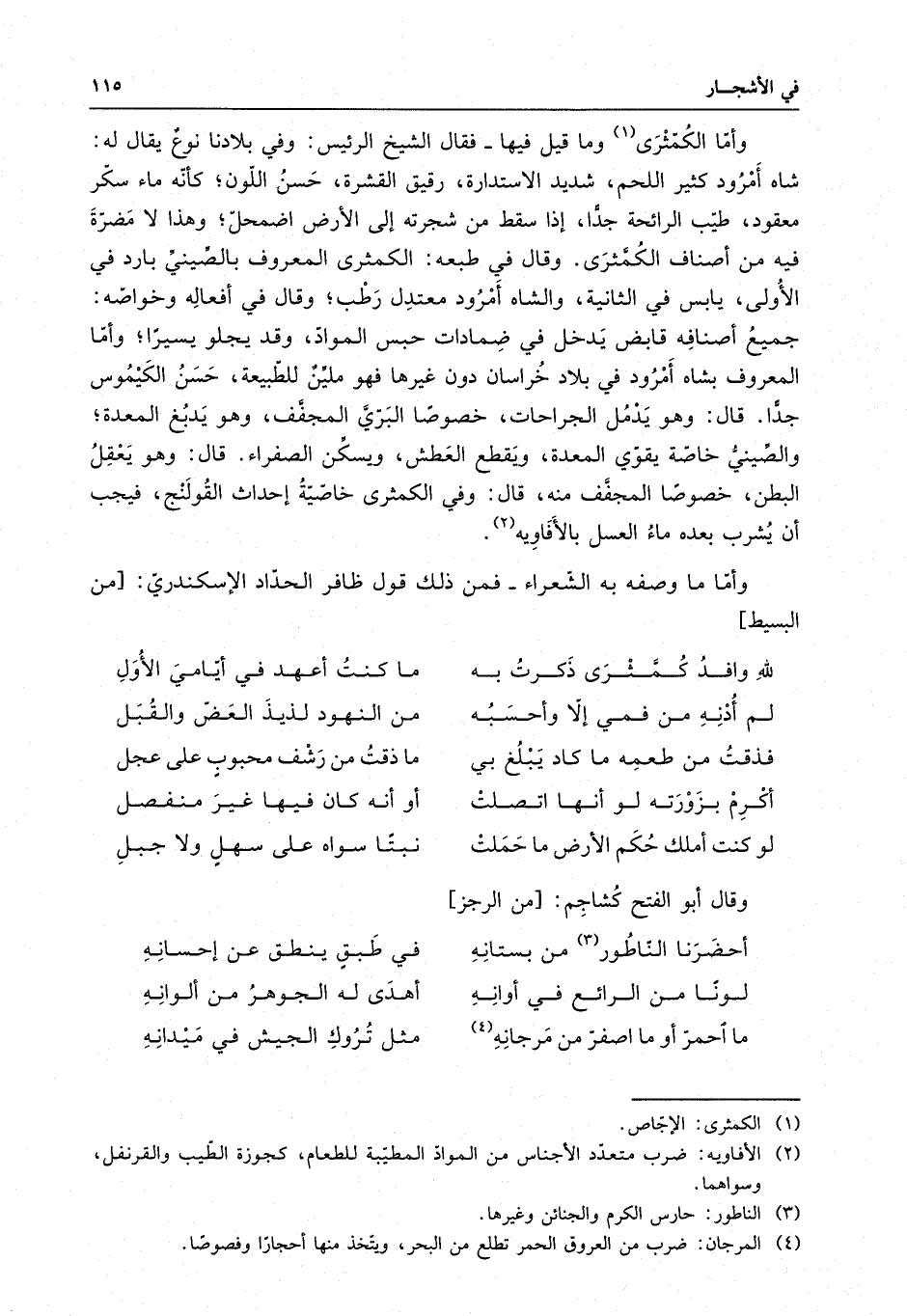 الكمثرى وما قيل فيها : فقال الشيخ الرئيس : وفي بلادنا نوع يقال له : شاه أمْرُود كثير اللحم ، شديد الاستدارة ، رقيق القشرة ، حسنُ اللون ، كأنه ماء سكر معقود ، طيب الرائحة جدا ، إذا سقط من شجرته إلى الأرض اضمحل ، وهذا لا مضرة فيه من أصناف الكمثرى . وقال في طبعه : الكمثرى معروف بالصيني بارد في الأولى ، يابس في الثانية ، والشاه أَمْرُود معتدل رطب ، وقال في أفعاله وخواصه : جميع أصنافه قابض يدخل في ضمادات حبس المواد ، وقد يجلو يسيرا ، وأما المعروف بشاه أَمْرُود في بلاد خُراسان دون غيرها فهو ملينٌ للطبيعة ، حسن الكَيْمُوس جدا . قال : وهو يَدْمُل الجراحات ، خصوصا البري المجفف ، وهو يدبغ المعدة ، والصيني خاصة يقوي المعدة ، ويقطع العطش ، ويسكن الصفراء . قال : وهو يعقل البطن ، خصوصا المجفف منه ، قال : وفي الكمثرى خاصيةُ إحداث القولنج ، فيجب أن يُشرب بعده ماء العسل بالأفَاوِيه .