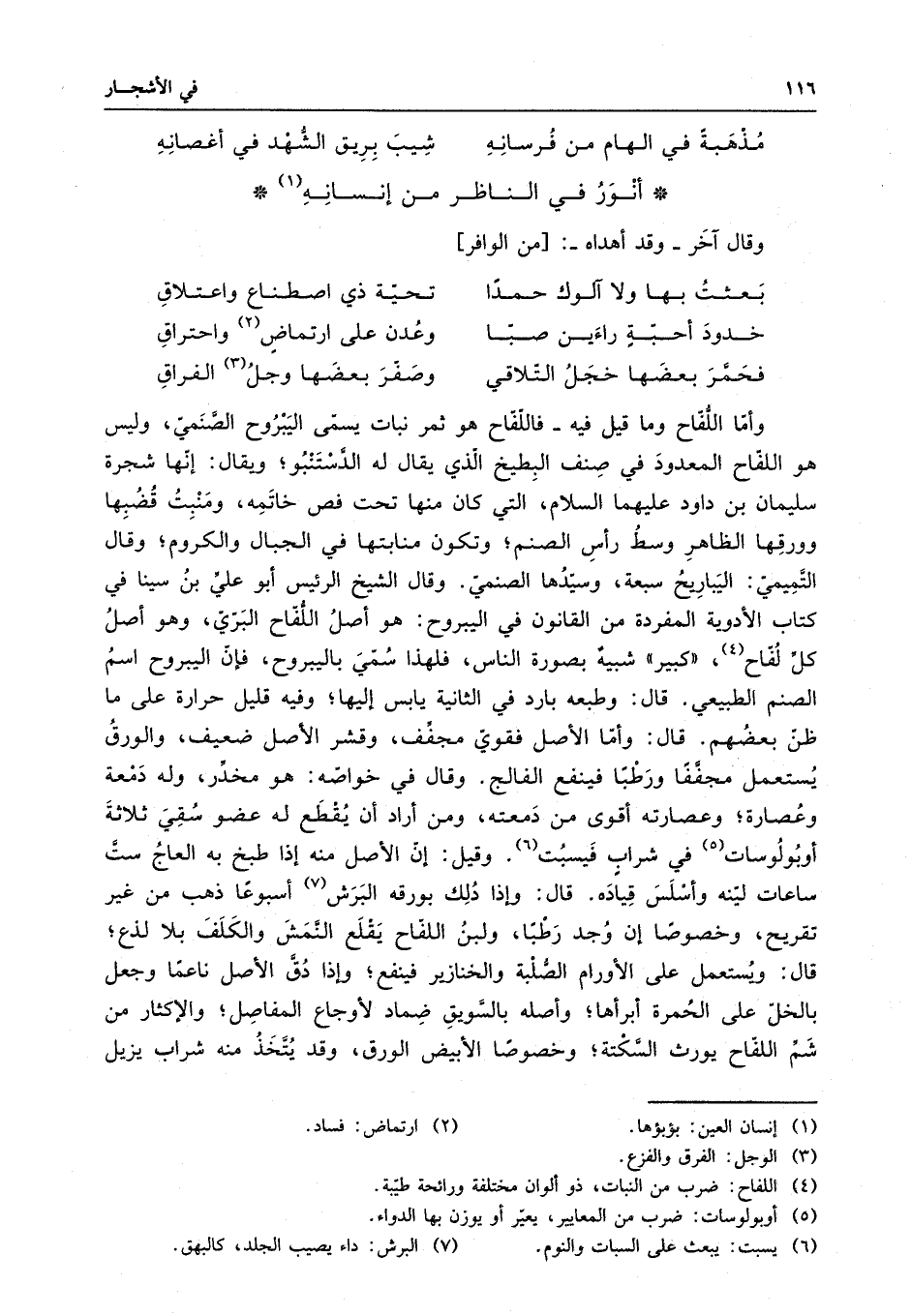 اللقاح وما قيل فيه : فاللقاح هو ثمر نبات يسمى اليبرُوح الصنمي ، وليس هو اللقاح المعدود في صنف البطيخ الذي يقال له الدَّسْتْنُبو ، ويقال : إنها شجرة سليمان بن داود - عليهما السلام - التي كان منها تحت قص خاتمه ، ومنبت قُضُبها وورقها الظاهر وسط رأس الصنم ، وتكون منابتها في الجبال والكروم ، وقال التميمي : اليباريحُ سبعة ، وسيدها الصنمي . وقال الشيخ الرئيس أبو علي بن سينا في كتاب الأدوية المفردة من القانون في اليبروح : هو أصلُ اللقاح البري ، وهو أصل كل لقاح ، " كبير " شبيهٌ بصورة الناس ، فلهذا سمي باليبروح ، فإن اليبروح اسم الصنم الطبيعي . قال : وطبعه بارد في الثانية يابس إليها ، وفيه قليل حرارة على ما ظن بعضهم . قال : وأما الأصل فقوي مجفف ، وقشر الأصل ضعيف ، والورق يستعمل مجففاً ورطباً فينفع الفالج . وقال في خواصه : هو مخدر ، وله دمعة وعصارته أقوى من دمعته ، ومن أراد أن يقطع له عضو سقى ثلاثة أو بُولُوسات في شرابٍ فيسبُت . وقيل : إن الأصل منه إذا طبخ به العاج ست ساعات لينه وأسلس قياده . قال : و إذا دلك بورقه البرش أسبوعاً ذهب من غير تقريح ، وخصوصاً إن وجد رطباً ، ولبن اللفاح يقلع النمش والكلف بلا لذع ، قال : ويستعمل على الأورام الصلبة والخنازير فينفع ، وإذا دق الأصل ناعماً وجعل بالخل على الحمرة أبرأها ، وأصله بالسويق ضماد لأوجاع المفاصل ، والإكثار من شم اللفاح يورث السكتة ، وخصوصاً الأبيض الورق ، وقد يتخذ منه شراب يزيل