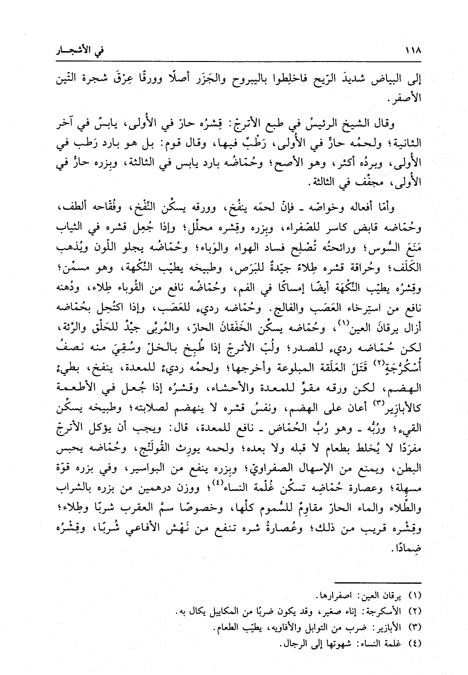 إلى البياض شديد الريح فاخلطوا باليبروح والجزر أصلا وورقا عرق شجرة التين الأصفر . وقال الشيخ الرئيس في طبع الأترج : قشره حار في الأولى ، يابس في آخر الثانية ، ولحمه حارٌ في الأولى ، رطبٌ فيها ، وقال قوم : بل هو بارد رطب في الأولى ، وبرده أكثر ، وهو الأصح ، وحُماضُه بارد يابس في الثالثة ، وبزره حار في الأولى ، مجفف في الثالثة . وأما أفعاله وخواصه - فإن لحمه ينفخ ، وورقه يسكن النفخ ، وفُقاحه ألطف ، وحُماضه قابض كاسر للصفراء ، وبزره وقشره محلل ، وإذا جعل قشره في الثياب منع السوس ، ورائحتهُ تُصلح فساد الهواء والوباء ، وحُماضُه يجلو اللون ويذهب الكلف ، وحُراقة قشره طلاءً جيدةٌ للبرص ، وطبيخه يطيب النكهة ، وهو مسمن ، وقشره يطيب النكهة أيضا إمساكا في الفم ، وحُماضُه نافع من القُوباء طلاء ، ودُهنه نافع من استرخاء العصب والفالج . وحُماضه رديء للعصب ، وإذا اكتحل بحماضه أزال يرقان العين ، وحُماضه يسكن الخفقان الحار ، والمُربي جيدٌ للحلق والرئة ، لكن حُماضه رديء للصدر ، ولب الأترج إذا طبخ بالخل وسقي منه نصفُ أُسْكُرُّجَةٍ قتل العلقة المبلوعة وأخرجها ، ولحمه رديءٌ للمعدة ، ينفخ ، بطيءُ الهضم ، لكن ورقه مقو للمعدة والأحشاء ، وقشره إذا جعل في الأطعمة كالأبازِير أعان على الهضم ، ونفس قشره لا ينهضم لصلابته ، وطبيخه يسكن القيء ، ورُبُّه - وهو رُبُّ الحُماض - نافع للمعدة ، قال : ويجب أن يؤكل الأترج مفردا لا يخلط بطعام لا قبله ولا بعده ، ولحمه يورث القُولنج ، وحُماضه يحبس البطن ، ويمنع من الإسهال الصفراوي ، وبزره ينفع من البواسير ، وفي بزره قوة مسهلة ، وعصارة حُماضه تسكن غُلمة النساء ، ووزن درهمين من بزره بالشراب والطلاء والماء الحارّ مقاومٌ للسموم كلها ، وخصوصا سم العقرب شربا وطلاء ، وقشره قريب من ذلك ، وعصارة قشره تنفع من نهش الأفاعي شُربا ، وقشره ضمادا .