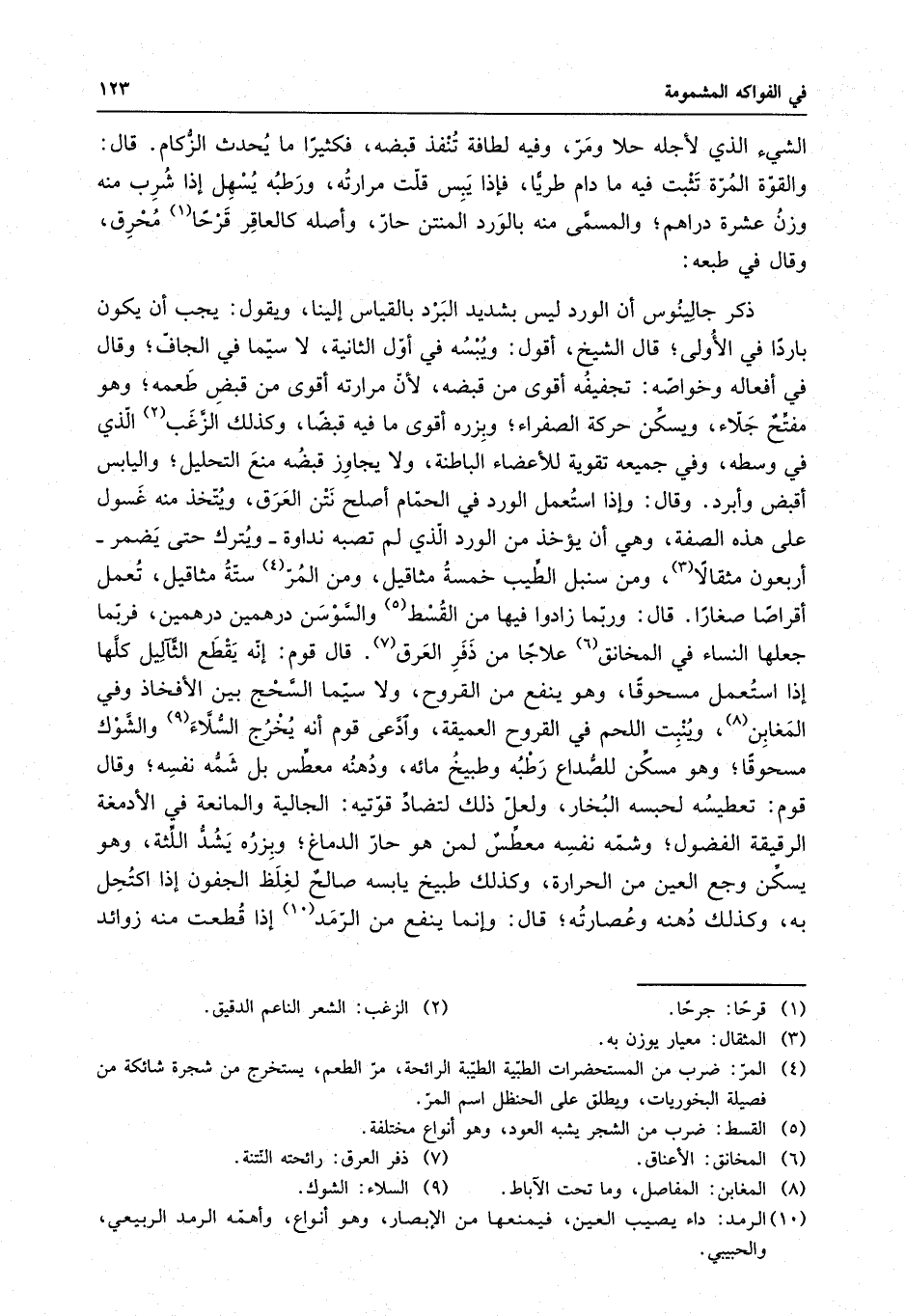 الشيء الذي لأجله حلا ومر ، وفيه لطافة تنفذ قبضه ، فكثيرا ما يُحدث الزكام . قال : والقوة المرة تثبت فيه ما دام طريا ، فإذا يبس قلت مرارتُه ، ورطبُه يُسهل إذا شُرب منه وزنُ عشرة دراهم ، والمسمى منه بالورد المنتن حار ، وأصله كالعاقِر قَرْحا مُحرِق ، وقال في طبعه : ذكر جالِينُوس أن الورد ليس بشديد البرد بالقياس إلينا ، ويقول : يجب أن يكون باردا في الأولى ، قال الشيخ ، أقول : ويُبْسُه في أول الثانية ، لا سيما في الجاف ، وقال في أفعاله وخواصه : تجفيفه أقوى من قبضه ، لأن مرارته أقوى من قبض طعمه ، وهو مفتحٌ جلاء ، ويسكن حركة الصفراء ، وبزره أقوى ما فيه قبضا ، وكذلك الزغب الذي في وسطه ، وفي جميعه تقوية للأعضاء الباطنة ، ولا يجاوز قبضه منع التحليل ، واليابس أقبض وأبرد . قال : وإذا استعمل الورد في الحمام أصلح نتن العرق ، ويتخذ منه غسول على هذه الصفة ، وهي أن يؤخذ من الورد الذي لم تصبه نداوة - ويترك حتى يضمر - أربعون مثقالا ، ومن سنبل الطيب خمسةُ مثاقيل ، ومن المُر ستةُ مثاقيل ، تُعمل أقراصا صغارا . قال : وربما زادوا فيها من القُسْط والسَّوسَن درهمين درهمين ، فربما جعلها النساء في المخانق علاجا من ذَفَرِ العَرَق . قال قوم : إنه يقطع الثآليل كلها إذا استعمل مسحوقا ، وهو ينفع من القروح ، ولا سيما السَّحْج بين الأفخاذ وفي المَغابِن ، وينبت اللحم في القروح العميقة وادعى قوم أنه يخرج السُّلاءَ والشوك مسحوقا ، وهو مسكن للصداع رطبه وطبيخُ مائه ، ودهنه معطس بل شمهٌّ نفسه ، وقال قوم : تعطيسُه لحبسه البخار ، ولعل ذلك لتضاد قوتيه : الجالية والمانعة في الأدمغة الرقيقة الفضول ، وشمه نفسه معطسٌ لمن هو حار الدماغ ، وبزره يشد اللثة ، وهو يسكن وجع العين من الحرارة ، وكذلك طبيخ يابسه صالحٌ لِغلظَ الجفون إذا اكتحل به ، وكذلك دهنه وعصارتهُ ، قال : وإنما ينفع من الرمد إذا قطعت منه زوائده