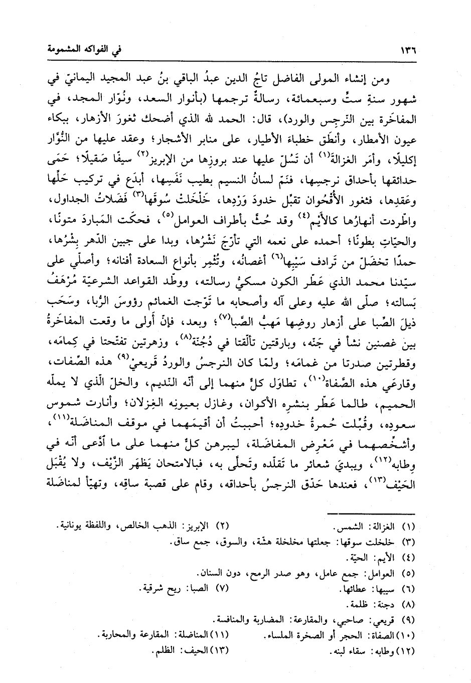 ومن إنشاء المولى الفاضل تاج الدين عبد الباقي بن عبد المجيد اليماني في شهور سنة ست وسبعمائة ، رسالةٌ ترجمها بأنوار السعد ، ونُوار المجد ، في المفاخرة بين النرجس ، قال : الحمد لله الذي أضحك ثغور الأزهار ، ببكاء عيون الأمطار ، وأنطق خطباء الأطيار ، على منابر الأشجار ، وعقد عليها من النوار إكليلا ، وأمر الغزالة أن تسل عليها عند بروزها من الإبريز سيفا صقيلاً ، حمى حدائقها بأحداق نرجِسها ، فنم لسانُ النسيم بطيب نفسها ، أبدع في تركيب حلها وعقدها ، فثغور الأقحوان تقبل خدود وردها ، خلخلت سُوقها فضلاتُ الجداول ، واطردت أنهارها كالأيم وقد حث بأطراف العوامل ، فحكت المبارد متونا ، والحيات بطونا ، أحمده على نعمه التي تأرج نشرها ، وبدا على جبين الدهر بِشرُها ، حمدا تخضل من ترادف سيبها أغصانهُ ، وتثمر بأنواع السعادة أفنانه ، وأصلى على سيدنا محمد الذي عطر الكون مسكي رسالته ، ووطد القواعد الشرعية مرهف بسالته ، صلى الله عليه وعلى آله وأصحابه ما توجت الغمائم رءوس الربا ، وسحب ذيل الصبا على أزهار روضها مهب الصبا ، وبعد ، فإن أولى ما وقعت المفاخرةُ بين غصنين نشآ في جنه ، وبارقتين تألقتا في دُجُنه ، وزهرتين تفتحتا في كمامه ، وقطرتين صدرنا من غمامه ، ولما كان النرجس والورد قريعي هذه الصفات ، وقارعي هذه الصفاة ، تطاول كل منهما إلى أنه النديم ، والخل الذي لا يمله الحميم ، طالما عطر بنشره الأكوان ، وغازل بعيونه الغزلان ، وأنارت شموس سعودِه ، وقبلت حمرةُ خدودِه ، أحببتُ أن أقيمهما في موقف المناضلة ، وأشخصهما في معرض المفاضله ، ليبرهن كلٌ منهما على ما ادعى أنه في وطابه ، ويبدي شعائر ما تقلده وتحلى به ، فبالامتحان يظهر الزيف ، ولا يقبل الحيف ، فعندها حدق النرجس بأحداقه ، وقام على قصبة ساقه ، وتهيأ لمناضلة