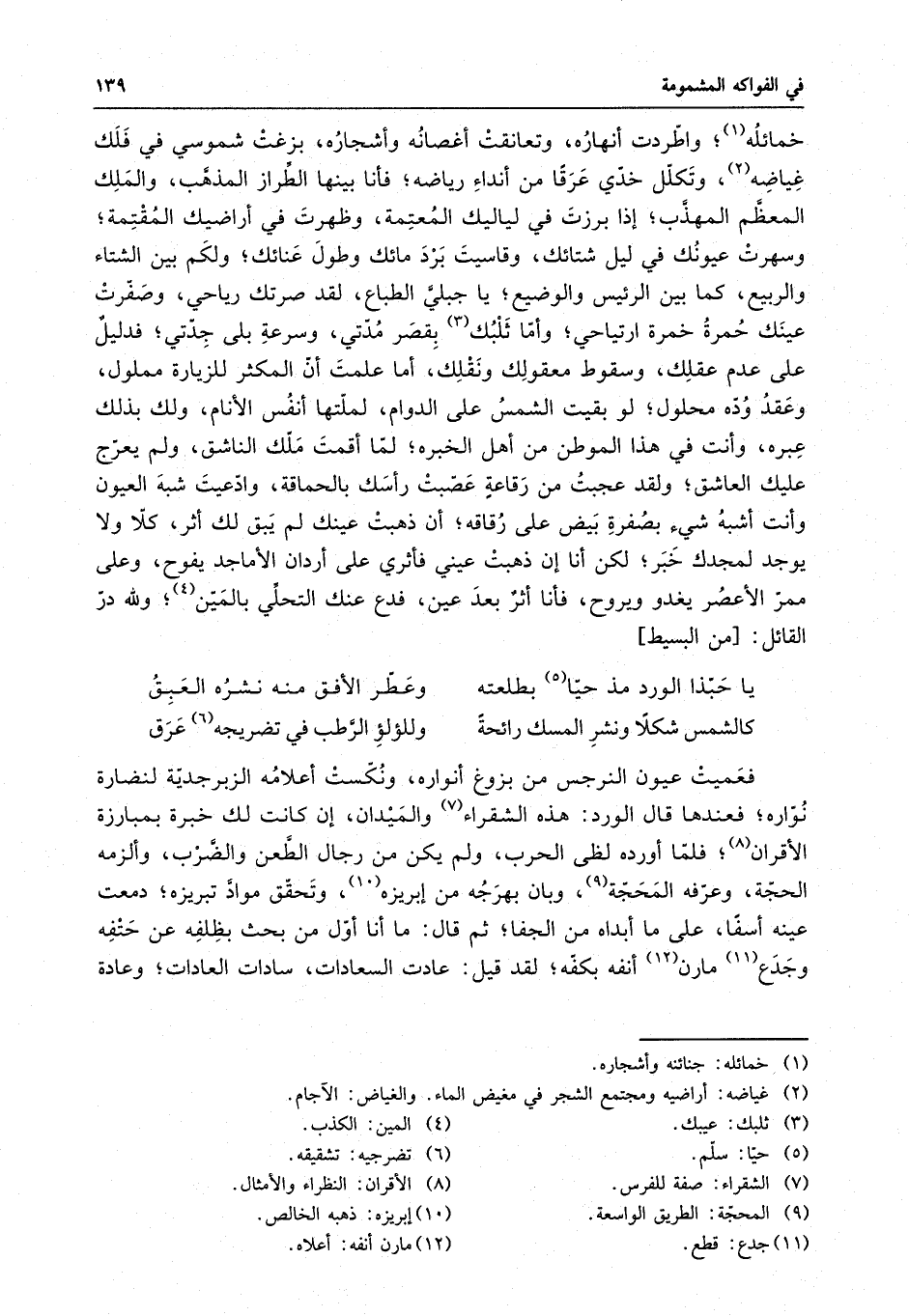 خمائلهُ ، واطردت أنهاره ، وتعانقتْ أغصانُه وأشجارُه ، بزغت شموسي في فلك غياضه ، وتكلل خدي عرقا من أنداءِ رياضه ، فأنا بينها الطراز المذهب ، والملك المعظم المهذب ، إذا برزت في لياليك المُعتمه ، وظهرت في أراضيك المُقتمه ، وسهرت عيونك في ليل شتائك ، وقاسيت برد مائك وطول عنائك ، ولكم بين الشتاء والربيع ، كما بين الرئيس والوضيع ، يا جبلي الطباع ، ولقد صرتك رياحي ، وصفرتْ عينك حُمرة خُمرة ارتياحي ، وأما ثلبُك بقصر مُدتي ، وسرعة بلى جِدتي ، فدليلٌ على عدم عقلك ، وسقوط معقولِك ونقلك ، أما علمت أن المكثر للزيارة مملول ، وعقد وده محلول ، لو بقيت الشمس على الدوام ، لملتها أنفس الأنام ، ولك بذلك عبره ، وأنت في هذا الموطن من أهل الخبرة ، لما أقمت ملك الناشق ، ولم يعرج عليك العاشق ، ولقد عجبتُ من رقاعةٍ عصبت رأسك بالحماقة ، وادعيت شبه العيون وأنت أشبه شيء بُصفرِة بيض على رُقاقه ، إن ذهبت عيني فأثرى على أردان الأمجاد يفوح ، وعلى ممر الأعصُر يغدو ويروح ، فأنا أثرٌ بعد عين ، فدع عنك التحلي بالمين ، ولله در القائل :