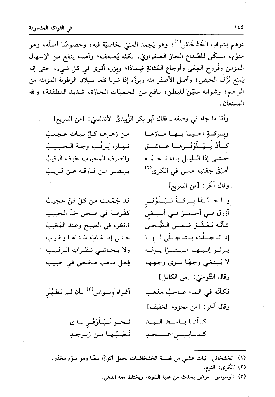 درهم بشراب الخشخاش ، وهو يُجمد المني بخاصية فيه ، وخصوصا أصله ، ينفع وهو منوم ، مسكن للصداع الحار الصفراوي ، لكنه يضعف ، وأصله ينفع من الإسهال المزمن وقروح المعي وأوجاع المثانة ضمادا ، وبزره أقوى من كل شيء ، حتى إنه يمنع نزف الحيض ، وأصل الأصفر منه وبزره إذا شربا نفعا سيلان الرطوبة المزمنة من الرحم ، وشرابه ملين للبطن ، نافع من الحميات الحارة ، شديد التطفئة ، والله المستعان .