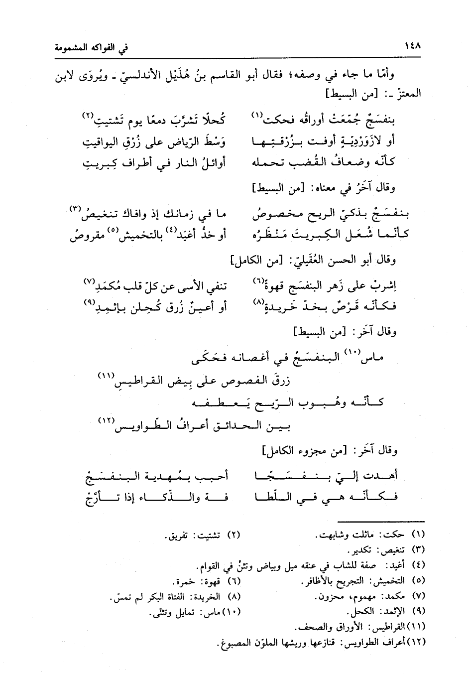 اشربْ على زهر البنفسج قهوةً . . . تنفي الأسى عن كل قلب مُكمَدِ فكأنه قرصٌ نجدُ خريدةٍ . . . أو أعينٌ زُرق كُحِلن بإثِمدِ