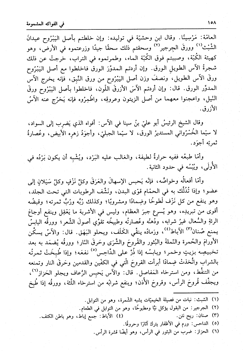 العامة : مَرْسِيناً . وقال ابن وحشية في توليده : وإن خلطتم بأصل اليبروح عيدان الشبث وورق الجرجير وسحقتم ذلك سحقاً جيداً وزرعتموه في الأرض ، وهو كهيئة الكُبة ، وصببتم فوق الكُبة الماء ، وطمرتوه في التراب ، خرجت عن ذلك شجرة الآس الطويل الورق . وإن أردتم المدور الورق فاخلطوا مع أصل اليبروح ورق الآس الطويل ، ونصف وزن أصل اليبروح من ورق النبق ، فإنه يخرج الآس المدور الورق . قال : وإن أردتم الآس الأزرق اللون ، فاخلطوا بأصل اليبروح ورق النيل ، واعجنوا معها من أصل الزيتون وعروقه ، واطمروه فإن يخرج عنه الآسُ الأزرق . وقال الشيخ الرئيس أبو علي بن سينا في الآس : أفواه الذي يضرب إلى السواد ، لا سيما الخُسْرُوانيُّ المستديرُ الورق ، لا سيما الجبلي ، وأجود زهره الأبيض ، وعُصارةُ ثمرته أجود . وأما طبعه ففيه حرارةٌ لطيفة ، والغالب عليه البرد ، ويشبه أن يكون برده في الأولى ، ويبسهُ في حدود الثانية . وأما أفعاله وخواصه ، فإنه يحبس الإسهال والعرق وكل نزفٍ وكل سيلانٍ إلى عضو ، وإذا تدلك به في الحمام قوي البدن ، ونشف الرطوبات التي تحت الجلد ، وهو ينفع من كل نزف لطخوا وضمادا ومشروبا ، وكذلك رُبه ورب ثمرته ، وقبضه أقوى من تبريده ، وهو يسرع جبر العظام ، وليس في الأشربة ما يعقل وينفع أوجاع الرئة والسعال غير شرابه ، ودهنه وعصارته وطبيخه تقوي أصول الشعر ، وورقه اليابسُ يمنع صنان الآباط ، ورماده ينقي الكلف ، ويجلوا البهق . قال : والآس يسكن الأورام والحمرة والنملة والبثور والقروح والشرى وحرق النار ، وورقه يضمد به بعد تخبيصه بزيتٍ وخمر ، ويابسُه إذا ذر على الداحس نفعه ، وإذا طُبختْ ثمرته بالشراب واتخذت ضمادا أبرأت القروح التي في الكفين والقدمين وحرق النار وتمنعه عن التنفط ، ومن استرخاء المفاصل . قال : والآس يحبس الرعاف ويجلو الجزاز ، ويجفف قروح الرأس ، وقروح الأذن ، وينفع شرابه من استرخاء اللثة ، وورقه إذا طبخ