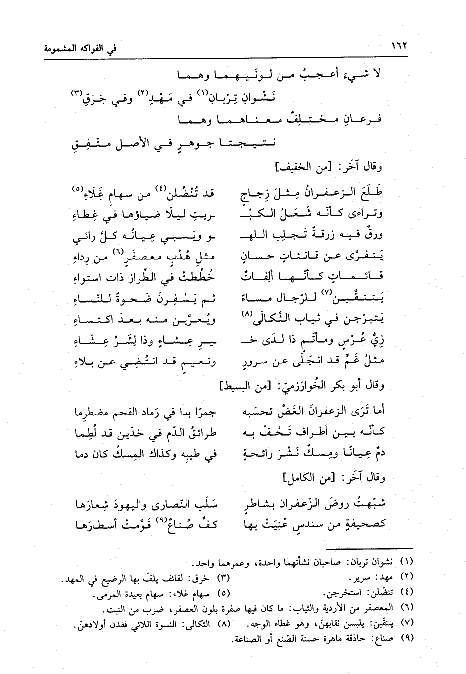 طلع الزعفرانُ مثل زجاجٍ . . . قد تُنُضلن من سهامِ غلاءِ