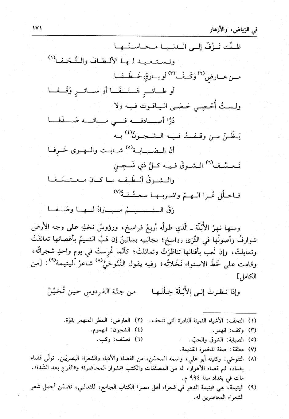 ومنها نهرُ الأُبُلة - الذي طوله أربعُ فراسخ ، ورءوسُ نخله على وجه الأرض شوارفُ وأصولها في الثرى رواسخ ، بجانبيه بساتينُ إن هب النسيمُ بأغصانها تعانقتْ وتمايلتْ ، وإن لعب بأفنانها تناظرتْ وتماثلتْ ، كأنما غُرستْ في يومٍ واحدٍ شجراتُه ، وقامت على خط الاستواء نَخَلاتُه ، وفيه يقول التنوخي شاعر اليتيمة :