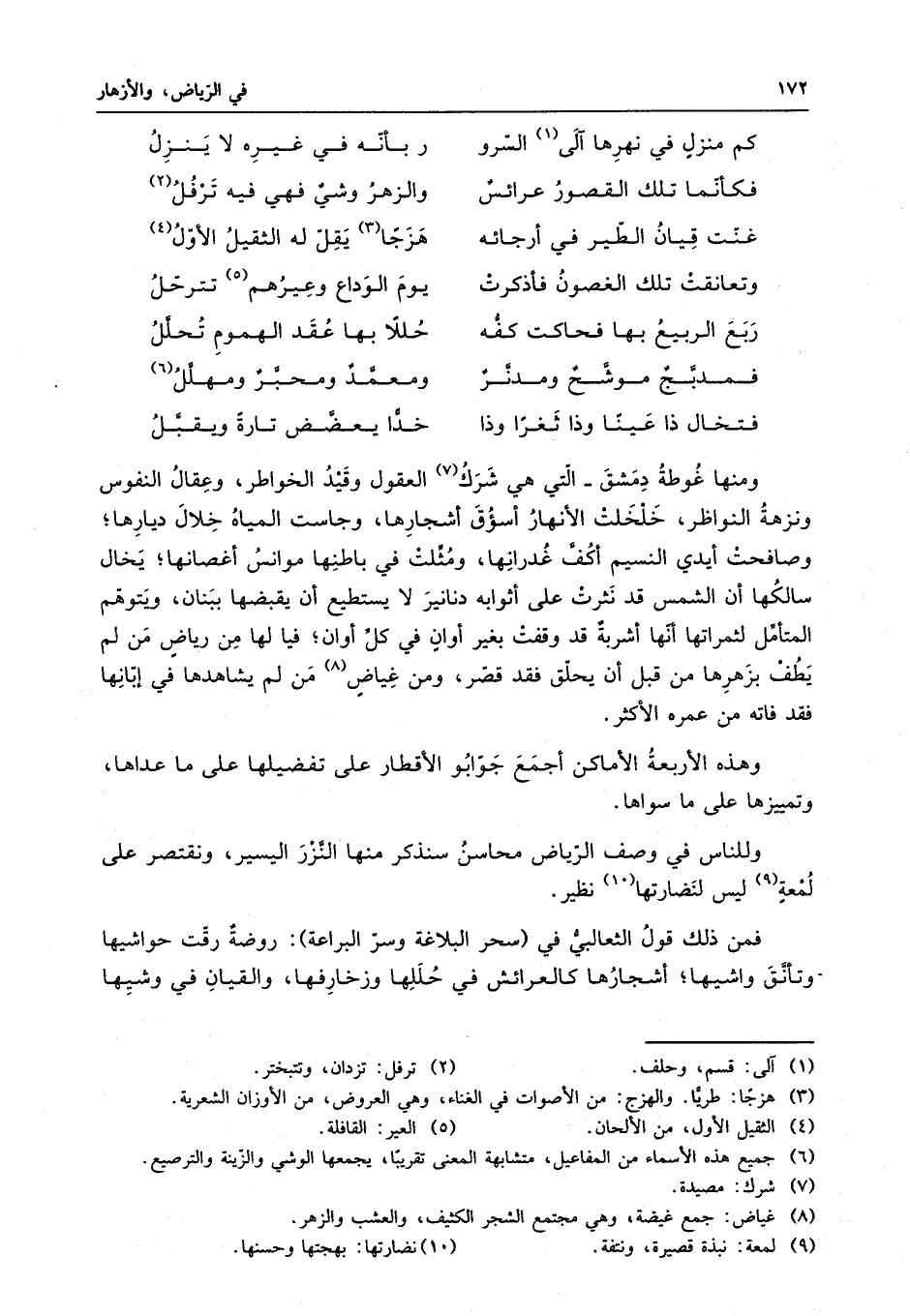 فمن ذلك قولُ الثعالبي في " سحر البلاغة وسر البراعة " : روضةٌ رقت حواشيها وتأنق واشيها ، أشجارها كالعرائس في حللها وزخارفها ، والقيان في وشيها