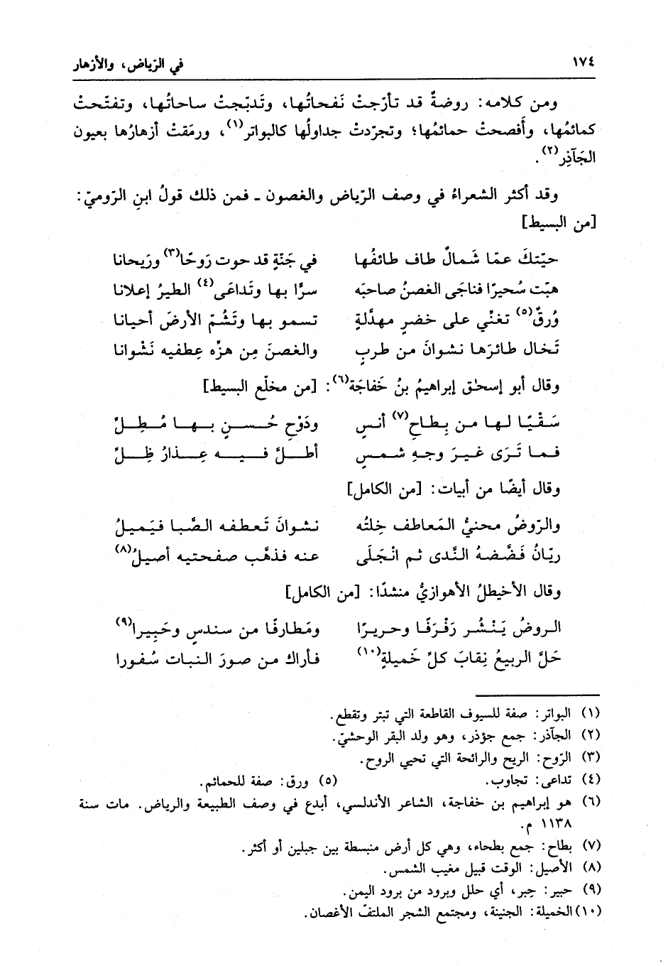 ومن كلامه : روضةٌ تأرجتْ نفحاتها ، وتدبجت ساحاتها ، وتفتحت كمائمها ، وأفصحت حمائمها ، وتجردت جداولها كالبواتر ، ورمقت أزهارها بعيون الجآذر .