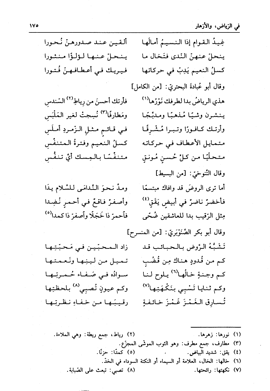 أما ترى الروض قد وافاك مبتسما . . . ومد نحو الندامي للسلام يدا فأخضرٌ ناضرٌ في أبيضٍ يققٍ . . . وأصفرٌ فاقعٌ في أحمرٍ نُضدا