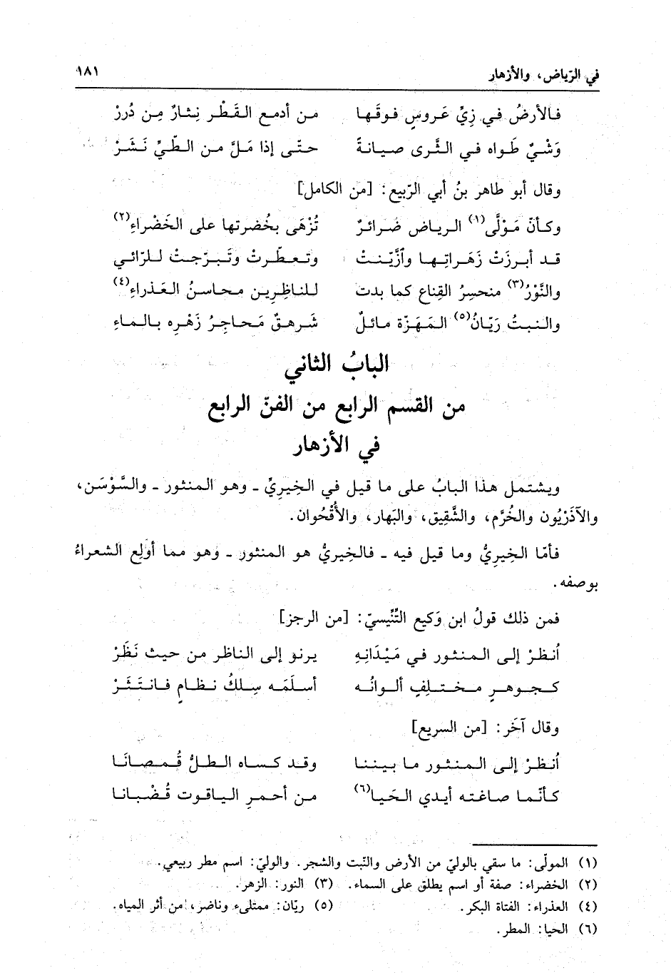 ويشتمل هذا البابُ على ما قيل في الخيري - وهو المنثور - والسوسن ، والآذريُون والخُرم ، والشقيق ، والبهار ، والأقحوان : الخيري فالخيري هو المنثور وهو مما أولِع الشعراء بوصفه . فمن ذلك قول أبن وكيع التنيسي :