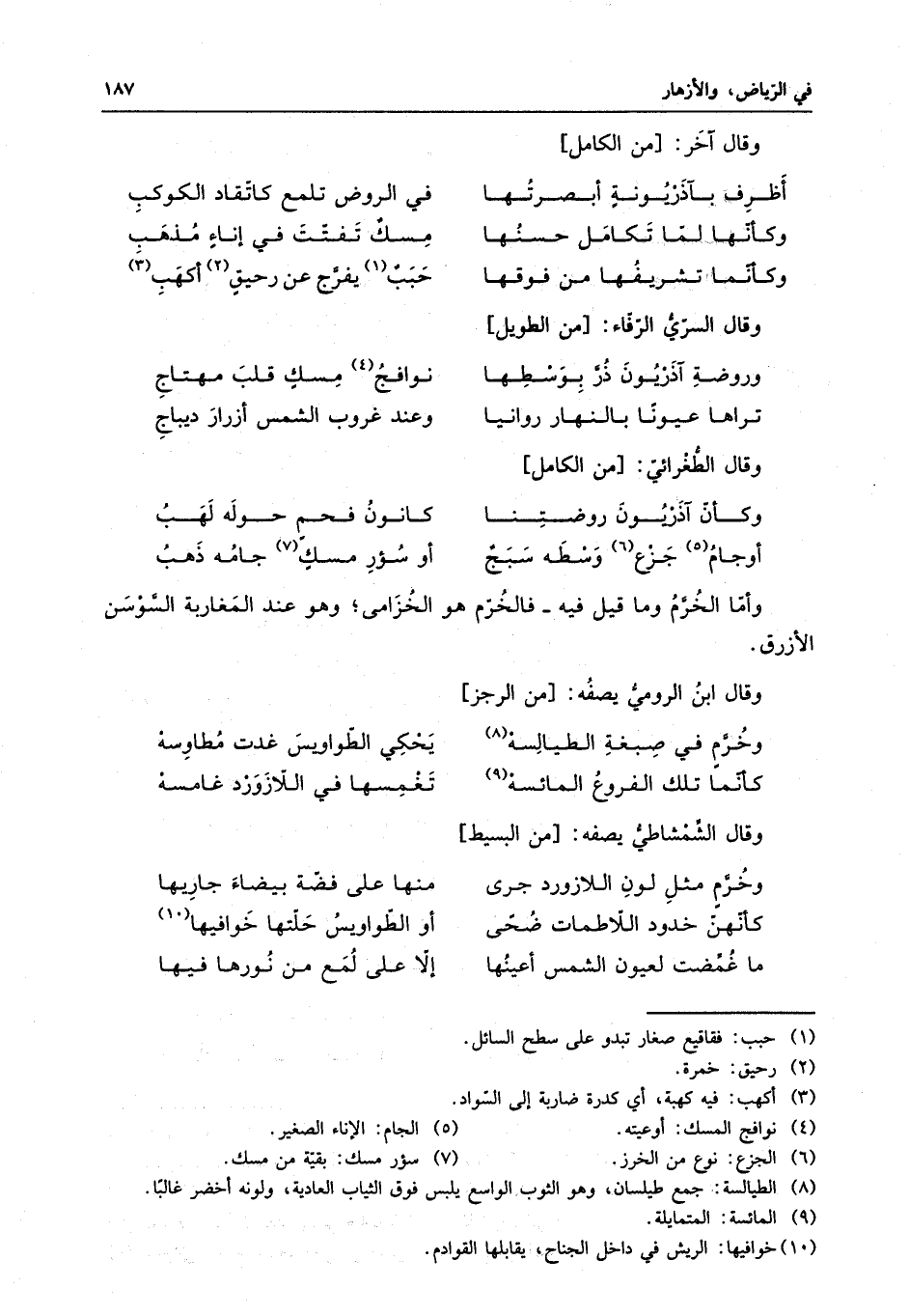 وخُرمٍ مثل لون اللازورد جرى . . . منها على فضة بيضاءَ جارِيها
