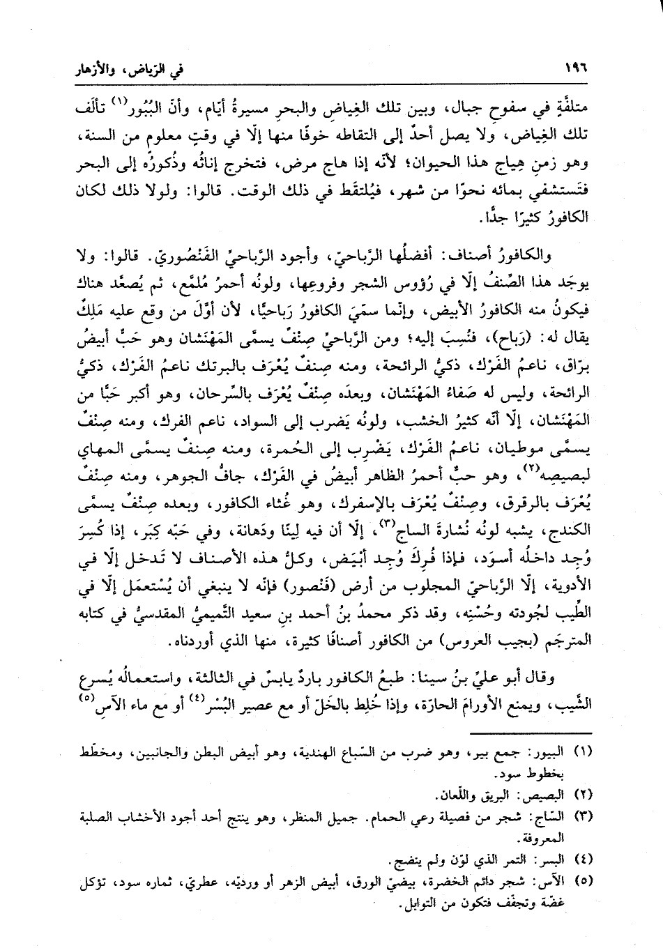 والكافور أصناف : أفضلُها الرباحي ، وأجود الرباحي الفَنْصُوري . قالوا : ولا يوجد هذا الصنفُ إلا في رءوس الشجر وفروعها ، ولونه أحمر ملمع ، ثم يصعد هناك فيكون منه الكافور الأبيض ، وإنما سمي بالكافور رباحيا ، لأن أول من وقع عليه ملكٌ يقال له : رباح ، فنُسب إليه ، ومن الرباحي صنفٌ يسمى المَهْنَشان وهو حب أبيضُ براق ، ناعمُ الفرك ، ذكي الرائحة ، ومنه صنفٌ يعرف بالبرتك ناعمُ الفَرْك ، ذكي الرائحة ، وليس له صفاءُ المَهْنَشان ، وبعده صنفٌ يعرف بالسرحان وهو أكبر حبا من المهنشان ، إلا أنه كثيرُ الخشب ، ولونه يضرب إلى السواد ناعم الفرك ، ومنه صنف يسمى موطيان ، ناعم الفَرْك ، يضرب إلى الحُمرة ، منه صنفٌ يسمى المهاي لبصيصه ، وهو حب أحمرُ الظاهر أبيضُ في الفَرْك ، جاف الجوهر ، ومنه صنفٌ يعرف بالرقرق ، وصنفٌ يعرف بالإسفرك ، وهو غُثاء الكافور ، وبعده صنفٌ يسمى الكندج ، يشبه لونه نشارة الساج ، إلا أن فيه لينا ودهانه ، وفي حبه كبر ، إذا كسر وجد داخله أسود ، فإذا فُرك وجد أبيض ، وكل هذه الأصناف لا تدخل إلا في الأدوية ، إلا الرباحي المجلوب من أرض فَنْصور فإنه لا ينبغي أن يُستعمل إلا في الطيب لجودته وحسنه ، وقد ذكر محمد بن أحمد ابن سعيد التميمي المقدسي في كتابه المترجم بجيب العروس من الكافور أصنافا كثيرة ، منها الذي أوردناه . وقال أبو علي بن سينا : طبعُ الكافور باردٌ يابسٌ في الثالثة ، واستعمالهُ يسرع الشيب ، ويمنع الأورام الحارة ، وإذا خلط بالخل أو مع عصير البُسْر أو مع ماء الآسِ