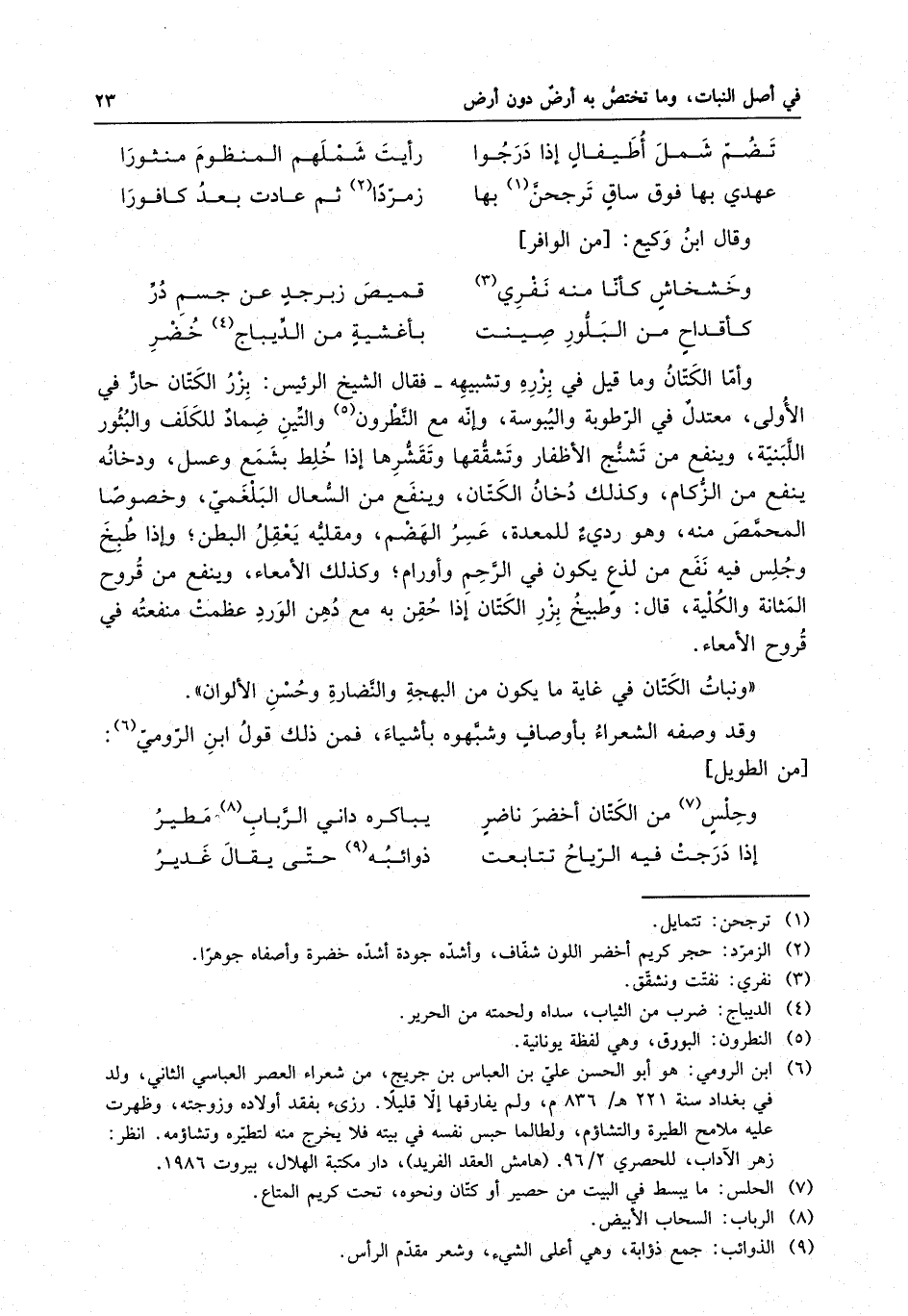 الكتان وما قيل في بزره وتشبيهه : فقال الشيخ الرئيس : بزر الكتان حار في الأولى ، معتدل في الرطوبة واليبوسة ، وإنه مع النَّطْرون والتين ضماد للكلف والبثور اللبنية ، وينفع من تشنج الأظفار وتشققها وتقشرها إذا خلط بشمع وعسل ، ودخانه ينفع من الزكام ، وكذلك دخان الكتان ، وينفع من السعال البَلْغَميّ ، وخصوصاً المحمص منه ، وهو رديء للمعدة ، عسر الهضم ، ومقلية يعقل البطن ، وإذا طبخ وجلس فيه نفع من لذعٍ يكون في الرحم وأورام ، وكذلك الأمعاء ، وينفع من قروح المثانة والكلية ، قال : وطبيخ بزر الكتان إذا حقن به مع دهن الورد عظمت منفعته في قروح الأمعاء . " ونبات الكتان في غاية ما يكون من البهجة والنضارة وحسن الألوان " . وقد وصفه الشعراء بأوصافٍ وشبهوه بأشياء ، فمن ذلك قول ابن الرومي : وحِلْسٍ من الكتان أخضر ناصر . . . يباكره داني الَّربابِ مطيرُ
