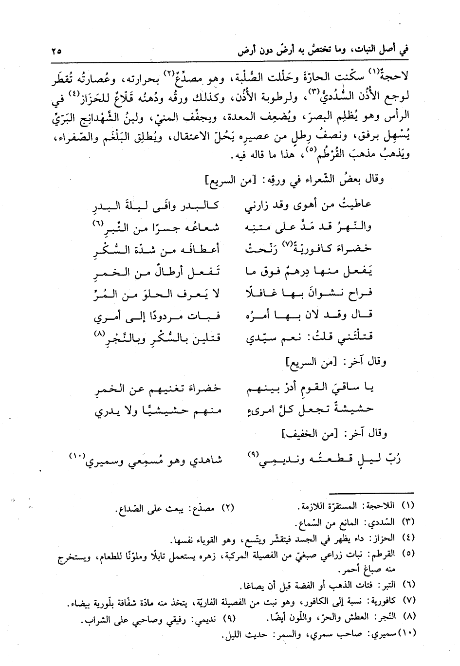 لا حجة سكنت الحازة وحللت الصلبة ، وهو مصدع بحرارته ، وعصارته تقطر لوجع الأذن السٌّدٌديّ ، ولرطوبة الأذن وكذلك ورقه ودهنه قلاع للحزاز في الرأس وهو يظلم البصر ، ويضعف المعدة ، ويجفف المنى ، ولبن الشَّهْدانِج البري يسهل برفق ، ونصف رطل من عصيره يحل الاعتقال ، ويطلق البلغم والصفراء ، ويذهب مذهب الِقٌرِطٌم ، هذا ما قاله فيه . وقال بعض الشعراء في ورقه :