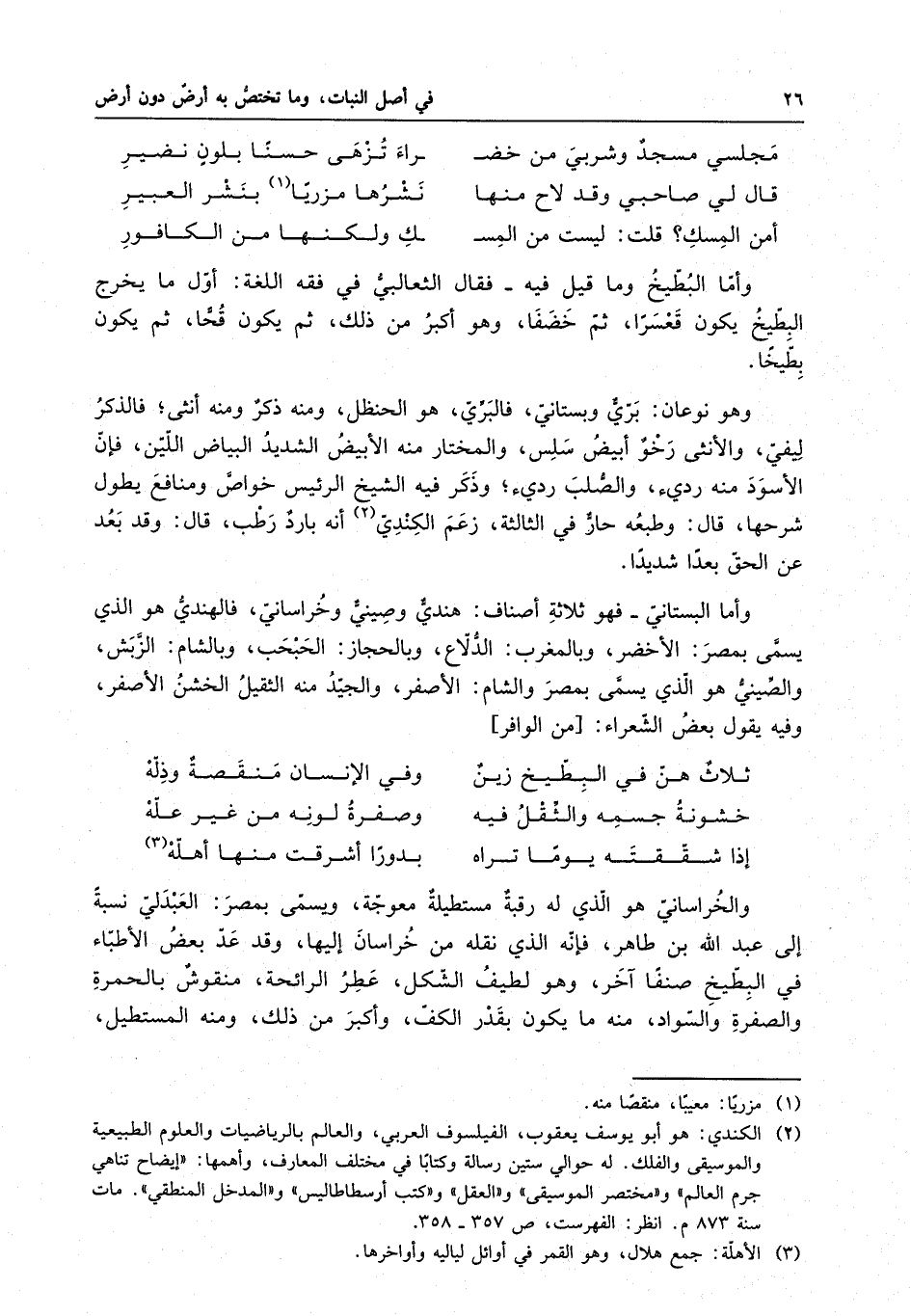 البطيخ وما قيل فيه : فقال الثعالبيٌّ في فقه اللغة : أول ما يخرج البطيخ يكون قَعْسَرا ، ثم خَضَفا ، وهو أكبر من ذلك ، ثم يكون قحا ، ثم يكون بطيخاً ، وهو نوعان : بري وبستاني ، فالبري ، هو الحنظل ، ومنه ذكر ومنه أنثى ، فالذكر ليفي ، والأنثى رخو أبيض سلس ، والمختار منه الأبيض الشديد البياض اللين ، فإن الأسود منه رديء ، والصلب رديء ، وذكر فيه الشيخ الرئيس خواص ومنافع يطول شرحها ، قال : وطبعه حار في الثالثة ، زعم الكندي أنه بارد رطب ، قال : وقد بعد عن الحق بعداً شديداً . وأما البستاني - فهو ثلاثة أصناف : هندي وصيني وخرساني ، فالهندي هو الذي يسمى بمصر : الأخضر ، بالمغرب : الدلاع ، وبالحجاز : الحَبْحَب ، وبالشام : الَّزبَش ، والصيني هو الذي بمصر والشأم : الأصفر ، والجيد منه الثقيل الخشن الأصفر ، وفيه يقول بعض الشعراء :
