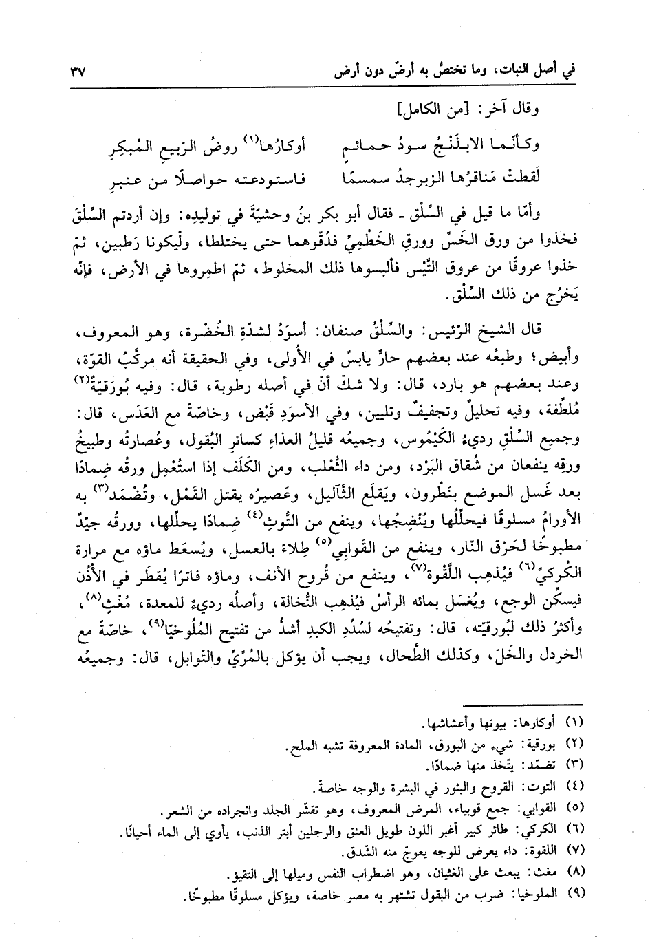 السلق فقال أبو بكر بن وحشية في توليده : وإن أردتم السلق فخذوا من ورق الخس وورق الخطمي فدقوها حتى يختلطا ، وليكونا رطبين ، ثم خذوا عروقا من عروق التيس فألبسوها ذلك المخلوط ، ثم اطمروها في الأرض ، فإنه يخرج من ذلك السلق . قال الشيخ الرئيس : والسلق صنفان : أسود لشدة الخضرة ، وهو معروف وأبيض ، وطبعه عند بعضهم حار يابس في الأولى ، وفي الحقيقة أنه مركب القوة ، وعند بعضهم هو بارد ، قال : ولا شك أن في أصله رطوبة ، قال : وفيه بورقية ملطفة ، وفيه تحليل وتجفيف وتليين ، وفي الأسود قبض ، وخاصة مع العدس ، قال : وجميع السلق رديء الكيموس ، وجميعه قليل الغذاء كسائر البقول ، وعصارته وطبيخ ورقه ينفعان من شقاق البرد ، ومن داء الثعلب ، ومن الكلف إذا استعمل ورقه ضمادا بعد غسل الموضع بنطرون ، ويقلع الثآليل ، وعصيره يقتل القمل ، تضمد به الأورام مسلوقاً فيحللها وينضجها ، وينفع من التوث ضمادا يحللها ، وورقه جيد مطبوخا لحرق النار ، وينفع من القوابي طلاء بالعسل ، ويسعط ماؤه مع مرارة الكركي فيذهب اللقوة ، وينفع من قروح الأنف ، وماؤه فاترا يقطر في الأذن فيسكن الوجع ، ويغسل بمائه الرأس فيذهب النخالة ، وأصله رديء للمعدة ، مغيثٍ ، وأكثر ذلك لبورقيته ، قال : وتفتيحه لسدد الكبد أشد من تفتيح الملوخيا ، خاصة مع الخردل والحل ، وكذلك الطحال ، ويجب أن يأكل بالمري والتوابل ، قال : وجميعه