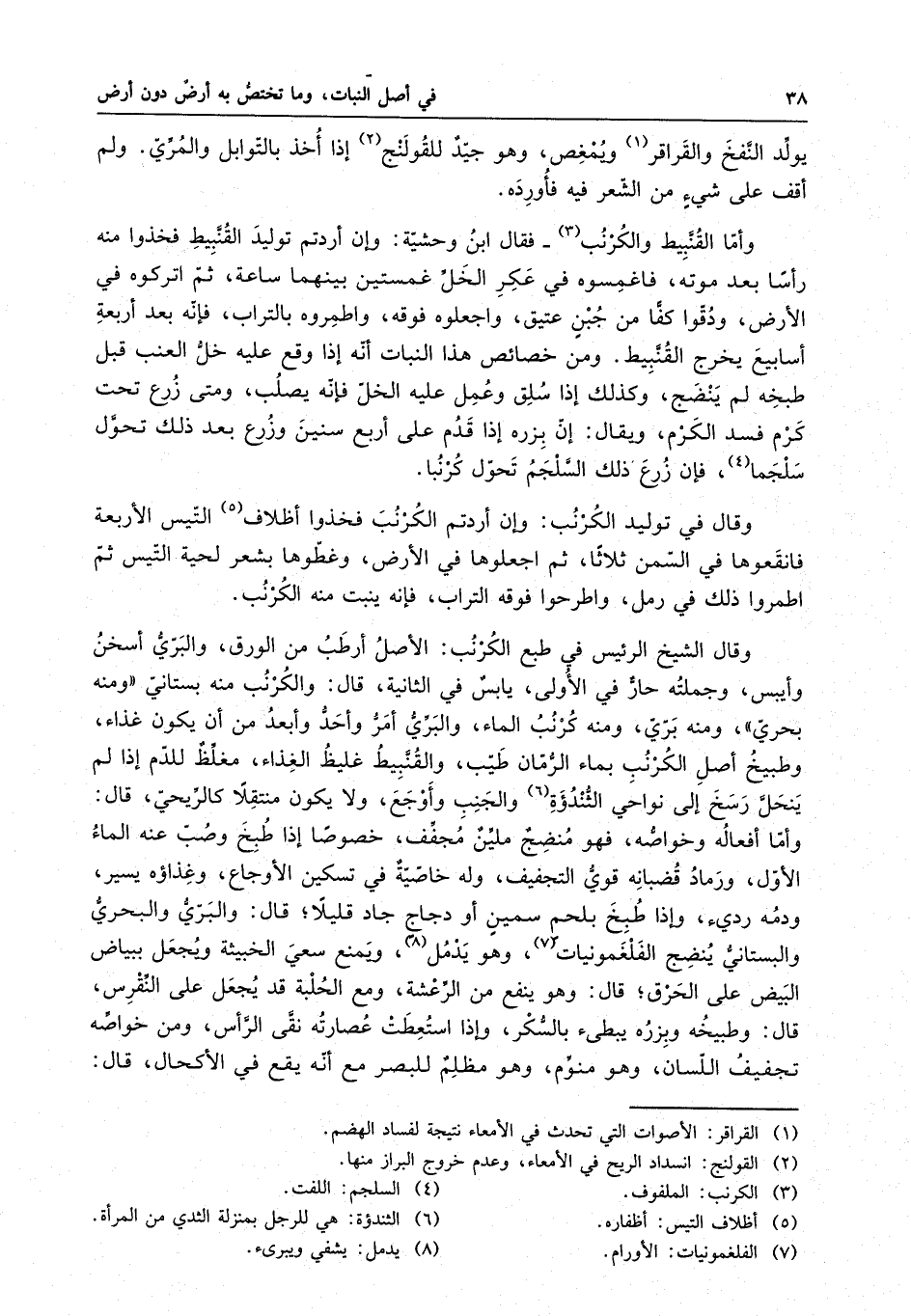 القنَّبِيط والكرنب فقال ابن وحشية : وإن أردتم توليد القنبيط فخذوا منه رأسا بعد موته ، فاغمسوه في عكر الخل غمستين بينهما ساعة ، ثم أتركوه في الأرض ، ودقوا كفا من جبنٍ عتيق ، واجعلوه فوقه ، واطمروه بالتراب ، فإنه بعد أربعة أسابيع يخرج القنبيط . ومن خصائص هذا النبات أنه إذا وقع عليه خل العنب قبل طبخه لم ينضج ، وكذلك إذا سلق وعمل عليه الخل فإنه يصلب ، ومتى زرع تحت كرمٍ فسد الكرم ، ويقال : إن بزره إذا قدم على أربع سنين وزرع بعد ذلك تحول سلجما ، فإن الزرع ذلك السلجم تحول كرنبا . وقال في توليد الكرنب : وإن أردتم الكرنب فخذوا أظلاف التيس الأربعة فانقعوها في السمن ثلاثاً ، ثم اجعلوها في الأرض ، وغطوها بشعر لحية التيس ثم اطمروا ذلك في رمل ، واطرحوا فوقه التراب ، فإنه ينبت منه الكرنب . وقال الشيخ الرئيس في طبع الكرنب : الأصل أرطب من الورق ، والبري أسخن وأيبس ، وجملته حار في الأولى ، يابس في الثانية ، قال : والكرنب منه بستاني ومنه بحري ومنه بري ، ومنه كرنب الماء ، البري أمر وأحد وأبعد من أن يكون غذاء ، وطبيخ أصل الكرنب بماء الرمان طيب ، والقنبيط غليظ الغذاء ، مغلظ للدم إذا لم ينحل رسخ إلى نواحي الثندؤة والجنب وأوجع ، ولا يكون منتقلا كالريحي ، قال وأما أفعاله وخواصه ، فهو منضج ملين مخفف ، خصوصا إذا طبخ وصب عنه الماء الأول ، ورماد قضبانه قوي التجفيف ، وله خاصية في تسكين الأوجاع ، وغذاءه يسير ، ودمه رديء ، وإذا طبخ بلحم سمينٍ أو دجاجٍ جاد قليلا ، قال : والبري والبحري والبستاني ينضج الفلغمونيات ، وهو يدمل ، ويمنع سعى الخبيثة ويجعل ببياض على الحرق ، قال : وهو ينفع من الرعشة ، ومع الحلبة قد يجعل على النقرس ، قال : طبيخه وبزره يبطيء بالسكر ، وإذا استطعت عصارته نقي الرأس ، ومن خواصه تجفيف اللسان ، وهو منوم ، وهو مظلم للبصر مع أنه يقع في الأكحال ، قال :