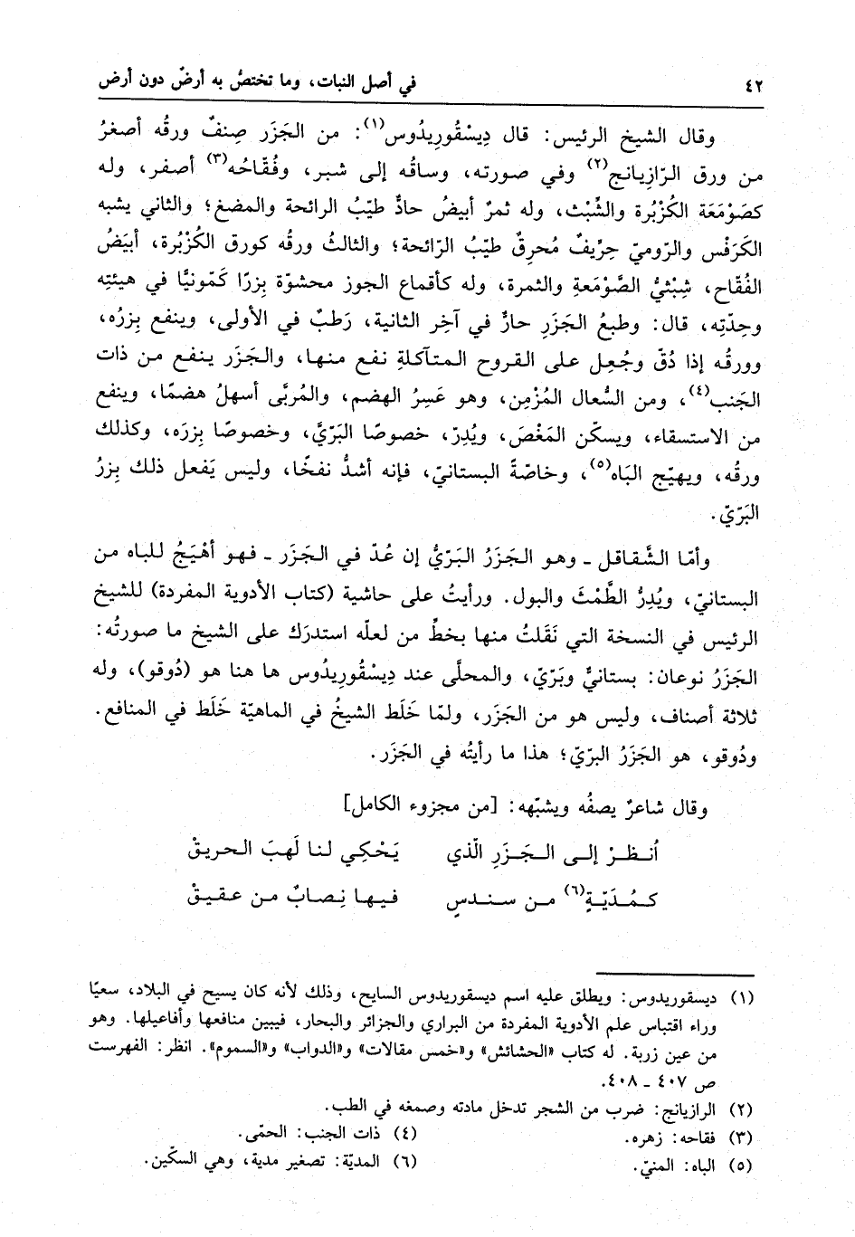 وقال الشيخ الرئيس : قال دِيسْقٌورِيدٌوس : من الجزر صنف ورقه أصغر من ورق الرّازِبانَج وفي صورته ، وساقه إلى شبر ، وفٌقّاحٌه أصفر ، وله كصومعة الكزبرة والشبث ، وله ثمر أبيض حاد طيب الرائحة والمضغ ، والثاني يشبه الكرفس الرومي حريف محرق طيب الرائحة ، والثالث ورقه كورق الكزبرة ، أبيض الفقاح ، شبثي الصومعة والثمرة ، وله كأقماع الجوز محشوة بزرا كمونيا في هيئته وحدته ، قال : وطبع الجزر حار في آخر الثانية ، رطب في الأولى ، وينفع بزره ، وورقه إذا دق وجعل على القروح المتأكلة نفع منها ، والجزر ينفع من ذات الجنب ، ومن السعال المزمن ، وهو عسر الهضم ، والمربى أسهل هضماً ، وينفع من الاستسقاء ، ويسكن المغص ، ويدر ، خصوصاً البرى ، وخصوصاً بزره ، وكذلك ورقه ، ويهيج الباه ، وخاصة البستاني ، فإنه أشد نفخاً ، وليس يفعل ذلك بزر البري .
