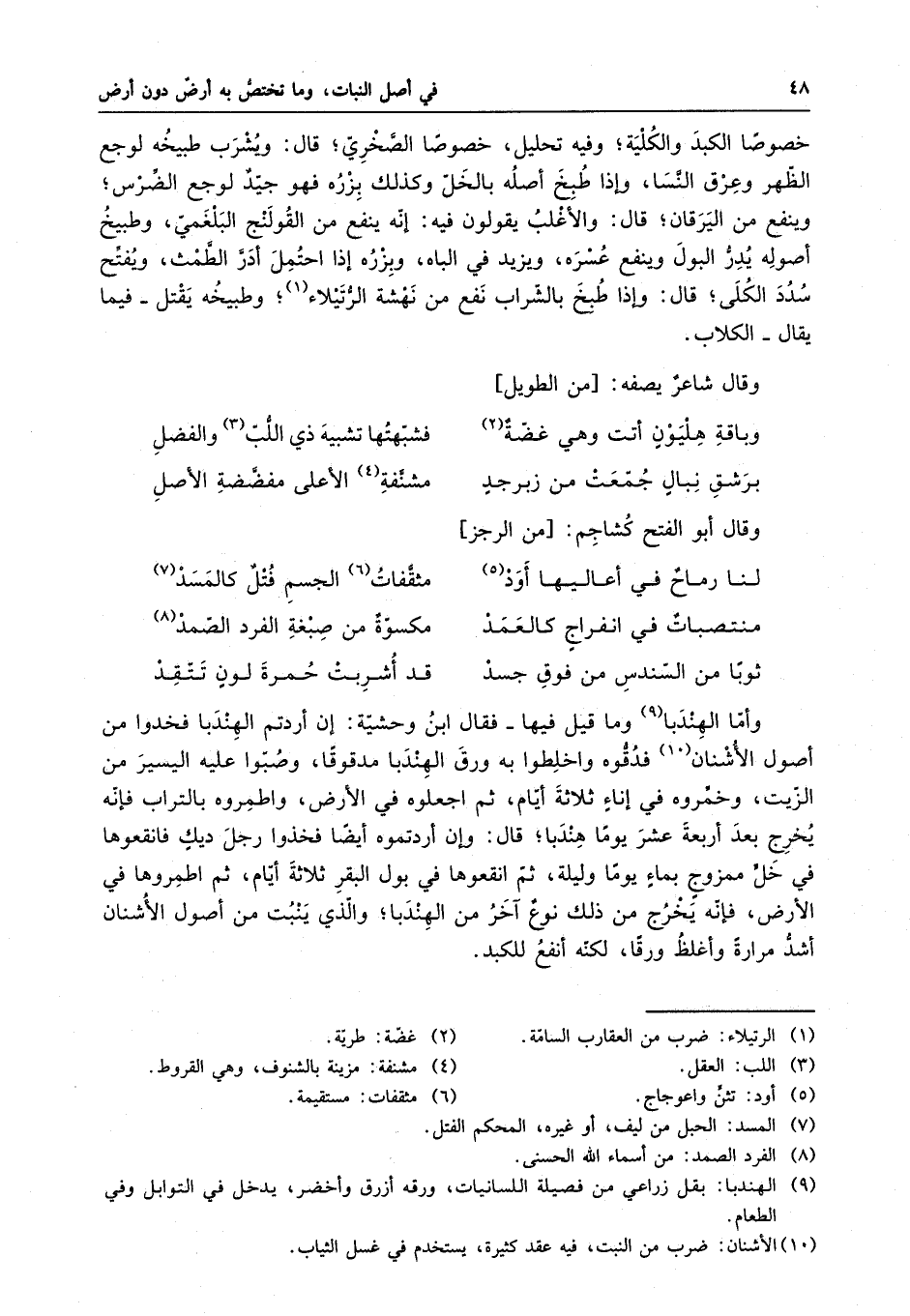 الهندبا وما قيل فيها : فقال ابن وحشية : إن أردتم الهندبا فخذوا من أصول الأشنان فدقوه واخلطوا به ورق الهندبا مدقوقا ، وصبوا عليه اليسير من الزيت ، وخمروه في إناء ثلاثة أيام ، ثم اجعلوه في الأرض ، وطمروه بالتراب فإنه يخرج بعد أربعة عشر يوما هندبا ، قال : وإن أردتموه أيضاً فخذوا رجل ديكٍ فانقعوها في خل ممزوجٍ بماءٍ يوما وليلة ، ثم انقعوها في بول البقر ثلاثة أيام ، ثم طمروها في الأرض ، فإنه يخرج من ذلك نوع آخر من هندبا ، والذي ينبت من أصول الأشنان أشد مرارةً وأغلظ ورقا ، لكنه أنفع للكبد .