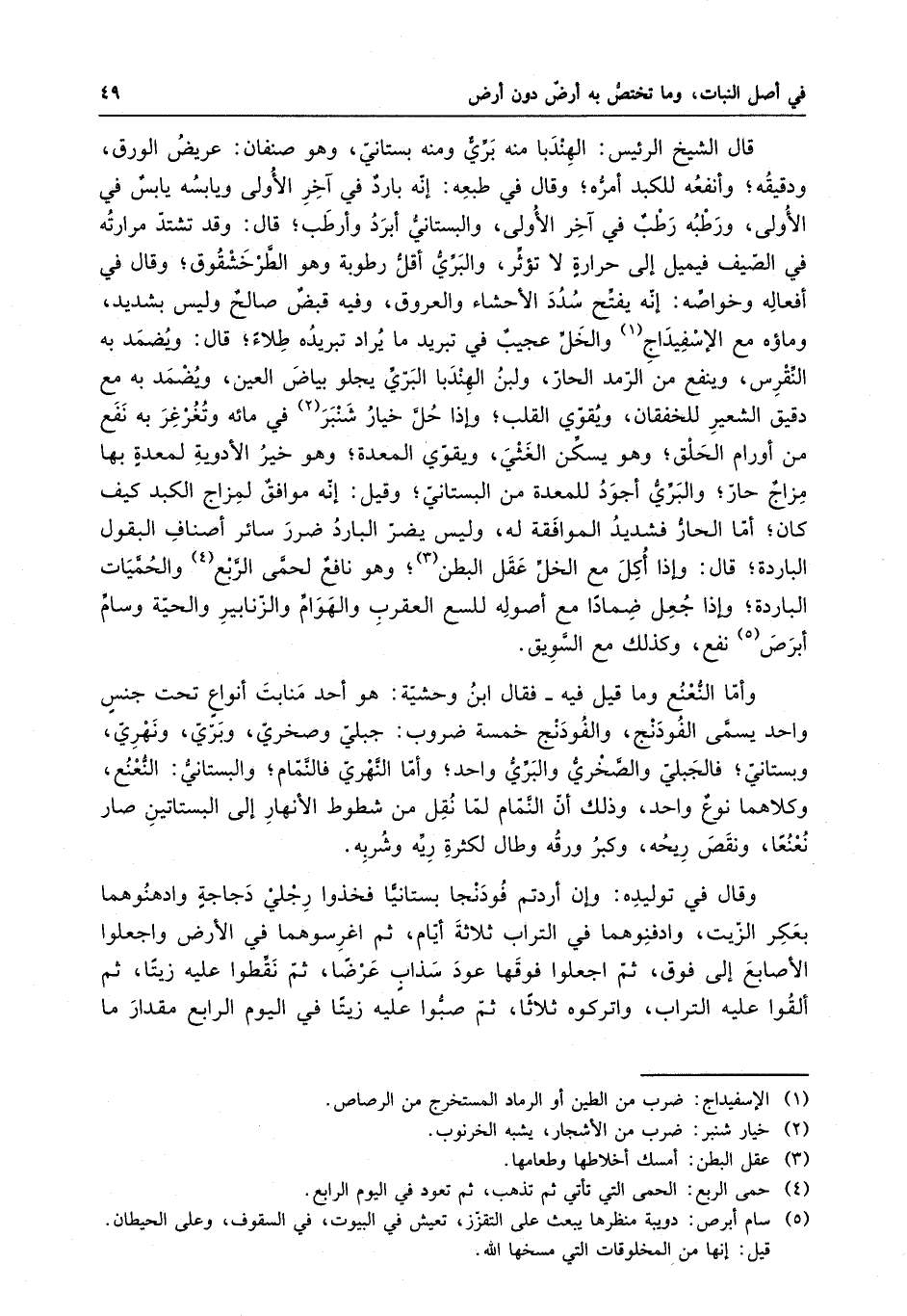 قال الشيخ الرئيس : الهندبا منه بري ومنه بستاني ، وهو صنفان : عريض الورق ، ودقيقه ، وأنفعه للكبد أمره ، وقال في طبعه : إنه بارد في آخر الأولى و يابسه يابس في الأولى ، ورطبه رطب في آخر الأولى ، والبستاني أبرد وأرطب ، قال : وتشتد مرارته في الصيف فيميل إلى حراراة لا تؤثر ، والبريٌّ أقل رطوبة وهو الَّطْرخَشْقٌوق ، وقال في أفعاله وخواصه : انه يفتح سدٌدَ الأحشاء والعروق ، وفيه قبض صالح وليس بشديد ، وماؤه مع الإسْفِيدَاجِ والخل عجيب في تبريد ما يراد تبريده طلاءً ، قال : ويضمد به النقرس ، وينفع من الرمد الحار ، ولبن الهندبا البري يجلو بياض العين ، ويضمد به مع دقيق الشعير للخفقان ، ويقوي القلب ، وإذا حل خيار شنبر في مائه وتغرغِر به نفع من أورام الحلق ، وهو يسكن الغثى ، ويقوي المعدة وهو خير الأدوية لمعدةٍ بها مزاج حار ، والبري أجود للمعدة من البستاني ، وقيل : أنه موافق لمزاج الكبد كيف كان ، أما الحار فشديد الموافقة له ، وليس يضر البارد ضرر سائر أصناف البقول الباردة ، وإذا أكل مع الخل عقل البطن ، وهو نافع لحمى الربع والحميات الباردة ، وإذا جعل ضمادا مع أصوله للسع العقرب والهوام والزنابير والحية وسام أبرص نفع ، وكذلك مع السويق .