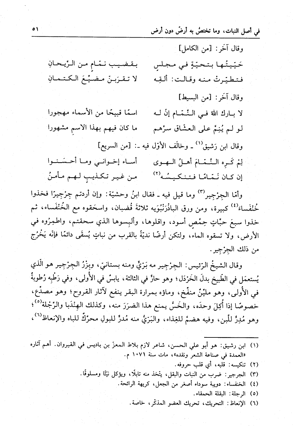 الجِرجِير وما قيل فيه : فقال ابن وحشية : وأن أردتم جرجيراً فخذوا خنفساء كبيرة ، ومن ورق الباذْرَنْوُيَه ثلاثة قصبان ، واسحقوه مع الخنفساء ، ثم خذوا سبع حبات حمصٍ أسود ، واقلوها ، وألبسوها الذي سحقتم ، واطمروه في الأرض ، ولا تسقوه بالماء ، ولتكن أرضا نديةِّ بالقرب من نباتٍ يسقي دائماً فإنه يخرج من ذلك الجرجير . وقال الشيخ الرئيس : الجرجير منه بريٌّ ومنه بستانيّ ، وبزر الجرجير هو الذي يستعمل في الطبيخ بدل الخردل ، وهو حار في الثالثة ، يابس في الأولى ، وفي رطبه رطوبة في الأولى ، وهو ملين منفَّخ ، وماؤه بمرارة البقر ينفع لآثار القروح ، وهو مصدَّع ، خصوصا إذا أكل وحده ، والخسٌّ يمنع هذا الضرر منه ، وكذلك الهِنْدَبا والَّرجْلة ، وهو مدر للبن ، وفيه هضم للغذاء ، والبري منه مدر للبول محرك اللباه والإنعاظ ،