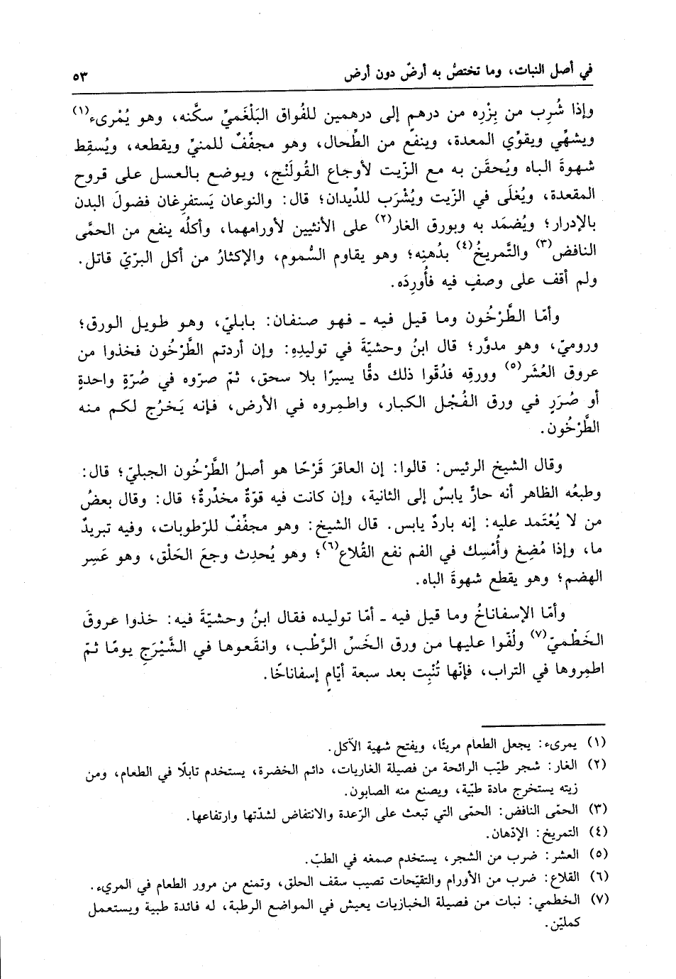 الطَّرْخُون فهو صنفان : بابليّ ، وهو طويل الورق ، وروميّ ، وهو مدوَّر ، قال ابن وحشية في توليده : وأن أردتم الطَّرْخُون فخذوا من عروق العشر وورقه فدقوا ذلك دقا يسيرا بلاسحق ، ثم صروه في صرةٍ واحدةٍ أو صررٍ في ورق الفجل الكبار ، واطمروه في الأرض ، فإنه يخرج لكم منه الطرخون . وقال الشيخ الرئيس : قالوا : إن العاقر قرحا هو أصل الطرخون الجبليّ ، قال : وطبعه الظاهر أنه حاَّر يابس إلى الثانية ، وإن كانت فيه قوة مخدرة ، قال : وقال بعض من لا يعتمد عليه : إنه بارد يابس . قال الشيخ : وهو مجفف للرطوبات ، وفيه تبريد ما ، وإذا مضغ وأمسك في الفم نفع القُلاع ، وهو يحدث وجع الحلق ، وهو عسر الهضم ، وهو يقطع شهوة الباه .