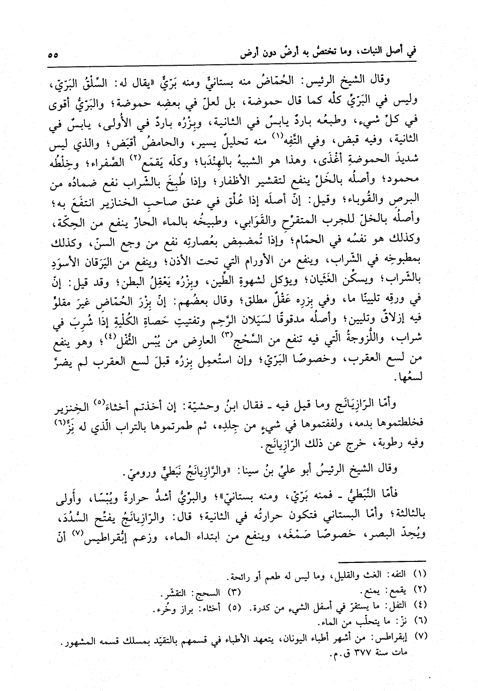 الرّازِيانَج وما قيل فيه : فقال ابن وحشية : إن أخذتم أخثاء الخنزير فخلطتموها بدمه ، ولفقتموها في شيءٍ من جلده ، ثم طمرتموها بالتراب الذي له نزوفيه رطوبة ، خرج عن ذلك الرّازِيانَج . قال الشيخ الرئيس أبو علي ابن سينا : " والرّازِيانَجُ نبطي ورومي فأما النبطي : فمنه بري ، ومنه بستاني ، والبري أشد حرارة ويبسا ، وأولى بالثالثة ، وأما البستاني فتكون حرارته في الثانية ، قال : الراّزِيانَجُ يفتح السدد ويحد البصر ، خصوصا صمغة ، وينفع من ابتداء الماء ، وزعم إبٌّقراطيس أن