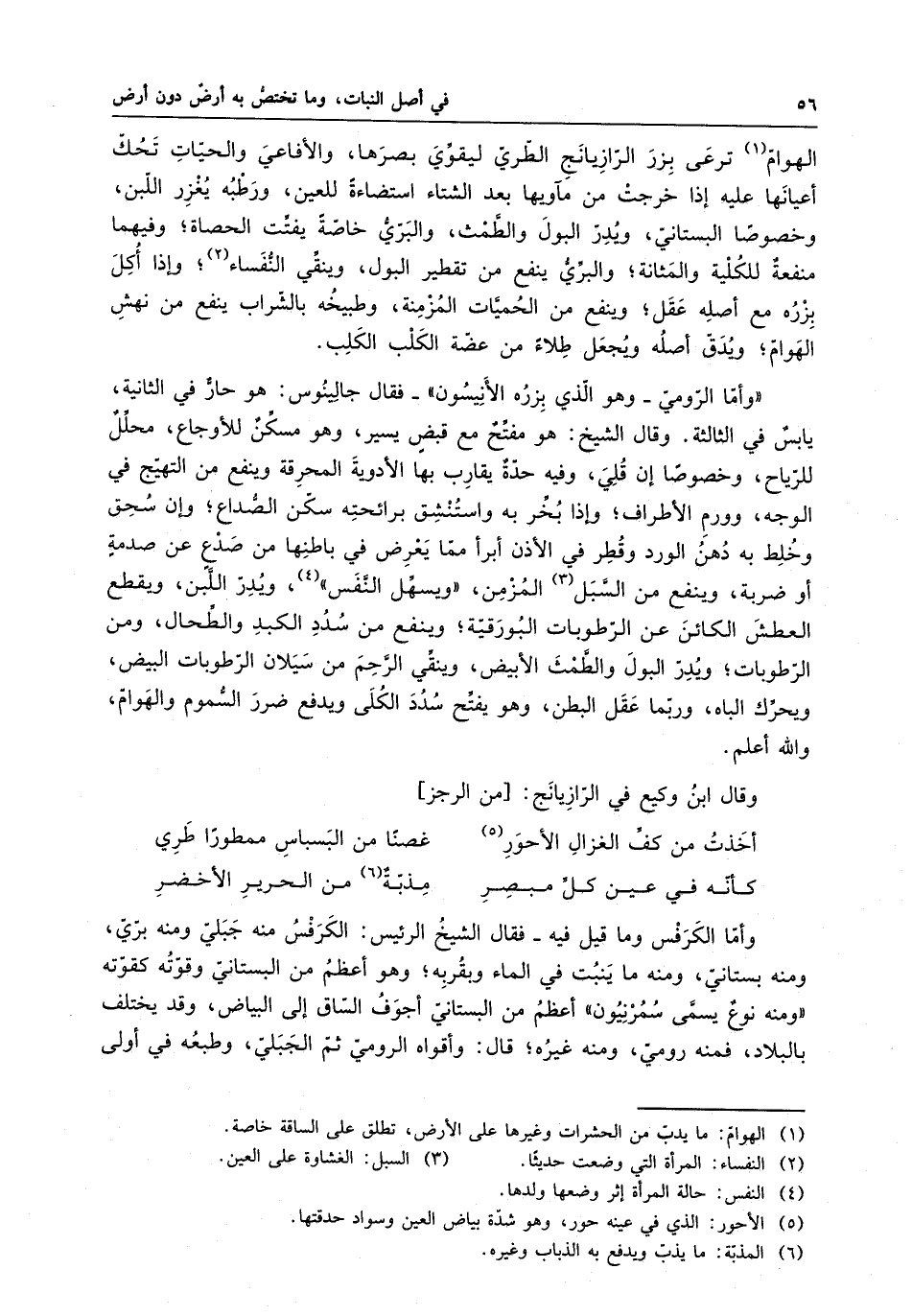 الهوام ترعى بزر الرازيانج الطري ليقوي بصرها ، والأفاعي والحيات تحك أعيانها عليه إذا خرجت من مآويها بعد الشتاء استضاءةً للعين ، ورطبه يغزر اللبن ، وخصوصا البستاني ، ويدر البول والطمث ، والبري خاصةً يفتِّت الحصاة ، وفيهما منفعة للكلية والمثانة ، والبري ينفع من تقطير البول ، وينقي النٌّفساء ، وإذا أكل بزره مع أصله عقل ، وينفع من الحميات المزمنة ، وطبيخه بالشراب ينفع من نهش الهوام ، ويدق أصله ويجعل طلاء من عضة الكلب الكَلبِ . " وأما الرومي : وهو الذي بزره الأنيُسون " فقال جالِينُوس : هو حار في الثانية ، يابس في الثالثة . وقال الشيخ : وهو مفتح مع قبضٍ يسير ، وهو مسكن للأوجاع ، محلل للرياح ، وخصوصا إن قلي ، وفيه حدة يقارب بها الأدوية المحرقة وينفع من التهيج في الوجه ، وورم هو مفتح مع قبضٍ يسير ، وهو مسكن للأوجاع ، محلل للرياح ، وخصوصا إن قلي ، وفيه حدة يقارب بها الأدوية المحرقة وينفع من التهيج في الوجه ، وورم الأطراف ، وإذا بخر به واستنشق برائحته سكن الصداع ، وإن سحق وخلط به دهن الورد وقطر في الأذن أبرأ مما يعرض في باطنها من صدعٍ عن صدمةٍ أو ضربة ، وينفع من السبل المزمن ، ويسهل النفس ويدر اللبن ، ويقطع العطش الكائن عن الرطوبات البورقية ، وينفع من سدد الكبد والطحال ، ومن الرطوبات ، ويدر البول والطمث الأبيض ، وينقي الرحم من سيلان الرطوبات البيض ، ويحرك الباه ، وربما عقل البطن ، وهو يفتح سدد الكلي ويدفع ضرر السموم والهوام ، والله أعلم . وقال ابن وكيع في الرازيانج :