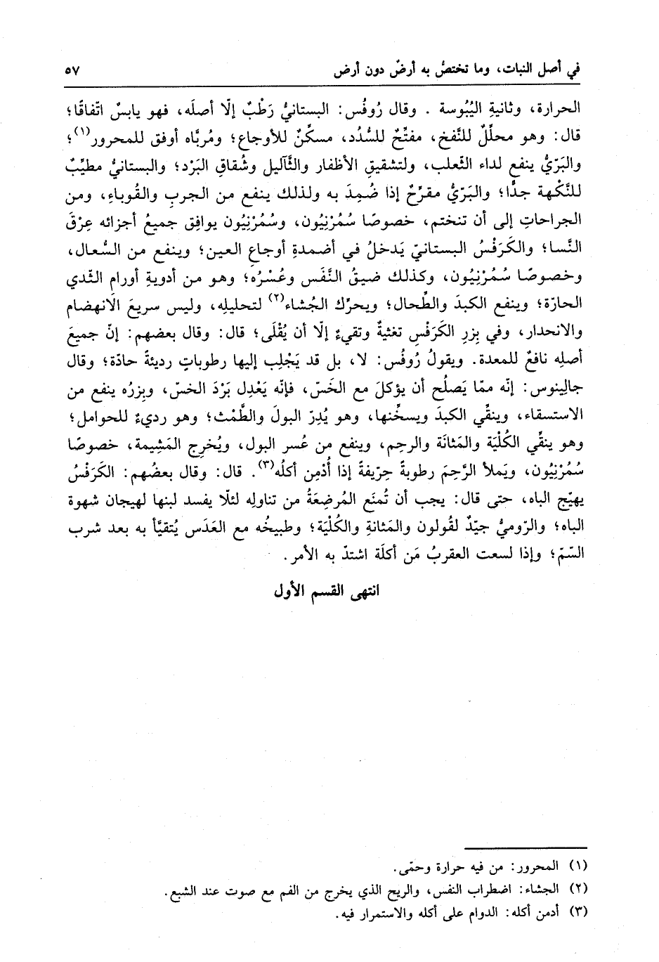 الحرارة ، وثانيه اليبوسة . وقال روفس : البستاني رطب إلا أصله ، فهو يابس اتفاقا ، قال : وهو محلل للنفخ ، مفتح للسدد ، مسكن للأوجاع ، ومرمر باه أوفق للمحور ، والبري ينفع لداء الثعلب ، ولتشقيق الأظفار والثآليل وشقاق البرد ، والبستاني مطيب للنكهة جداً ، والبري مقرح إذا ضمد به ولذلك ينفع من الجرب والقوباِء ، ومن الجراحات إلى أن تنختم ، خصوصا سُمُرْنيُون و سُمُرِنيُون يوافق جميع أجزائه عرق النسا ، والكرفس البستاني يدخل في أضمدة أوجاعِ العين ، وينفع السعال ، وخصوصا سُمُرْنيُون ، وكذلك ضيق النفس وعسره ، وهو من أدوية أورام الثدي الحارة ، وينفع الكبد والطحال ، ويحرك الجُشاءَ لتحليه ، وليس سريع الأنهضام والأنحدار ، وفي بزر الكرفس تغثية وتقيء إلا أن يقلي ، قال : وقال بعضهم : إن جميع أصله نافع المعدة . ويقول روفس : لا ، بل قد يجلب إليها رطوباتٍ رديئةً حادة ، وقال جالينوس : إنه مما يصلح أن يؤكل مع الخس ، فإنه يعدل برد الخس ، وبزره ينفع من الأستقساء ، وينقي الكبد ويسخنها ، وهو يدر البول والطمث ، وهو رديء للحوامل ، وهو ينقي الكلية والمثانة والرحم ، وينفع من عسر البول ، ويخرج المشيمة ، خصوصا سُمُرْنِيُون ويملاء الرحم رطوبةً حريفةً إذا أدمن أكله . قال : وقال بعضهم : الكرفس يهيج الباه ، حتى قال : يجب أن تمنع المرضعة من تناوله لئلا يفسد لبنها لهيجان شهوة الباه ، والرومي جيد لقولون والمثانة والكلية ، وطبيخه مع العدس يتقيأ به بعد شرب السم ، وإذا لسعت العقرب من أكله اشتد به الأمر . انتهى القسم الأول .